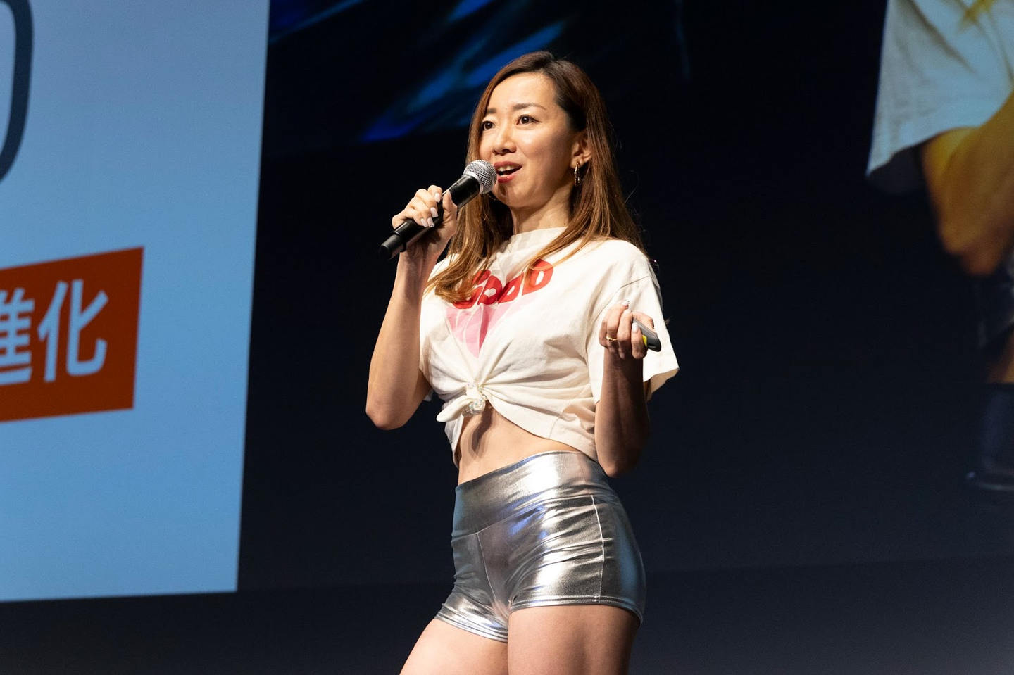 <ケラッタCEO Shimonne-san:さすが大会に出るだけあって、衣装もポーズもスタイルもバッチリ決めて登場!体脂肪率と利益率の目標宣言はわかりやすい&覚えやすいと好評>