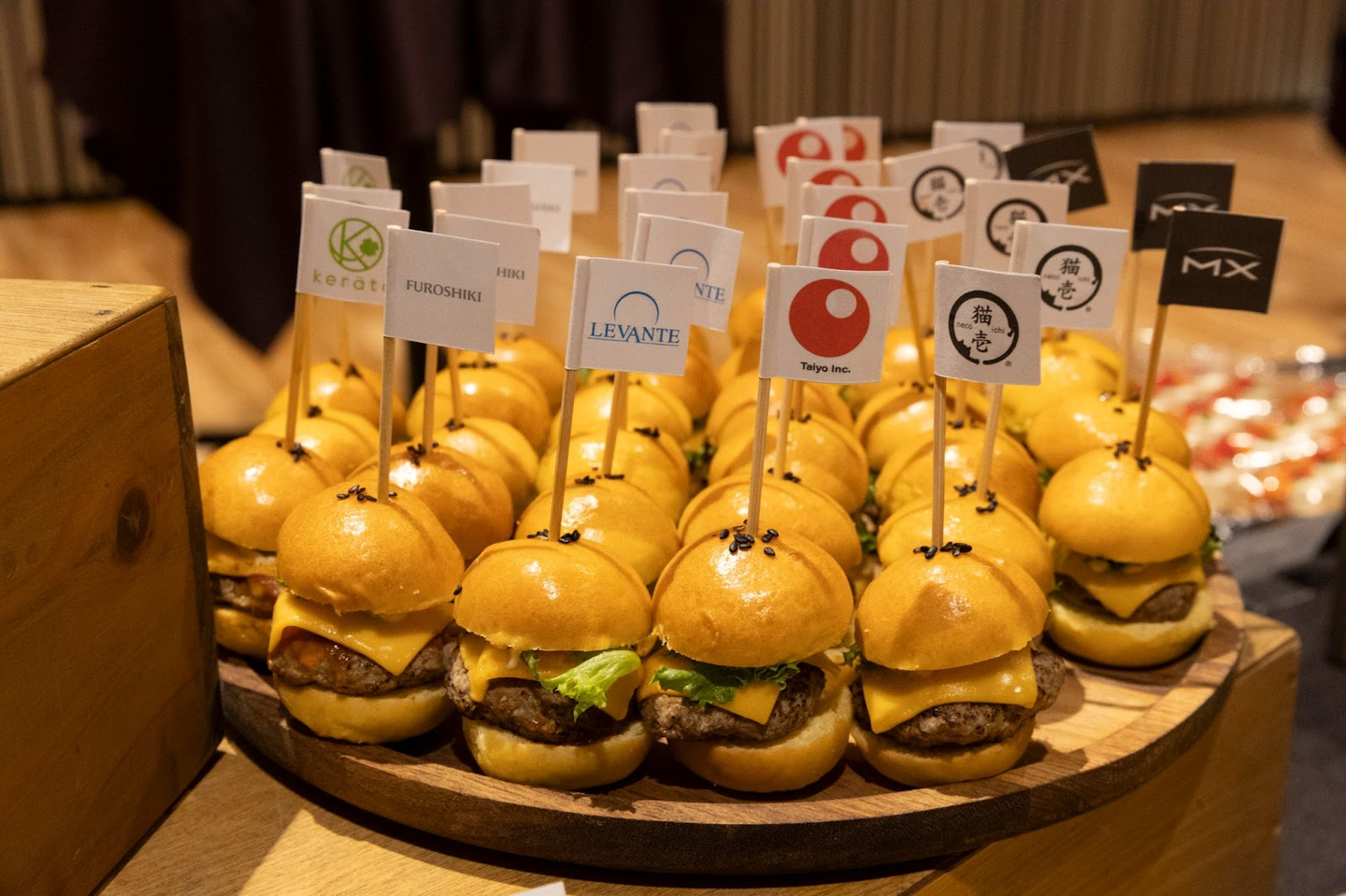 各グループ会社のロゴ入りオリジナルフードがみなさんをお出迎え。