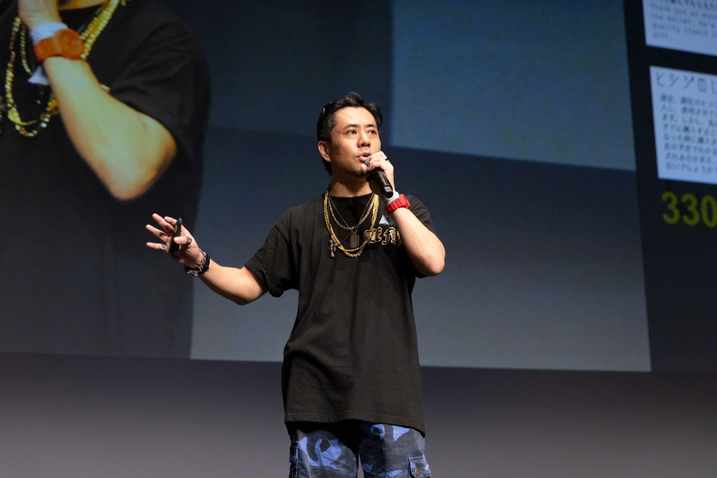 <カツラとサングラスを脱ぎ捨て、すぐにプレゼンモードに切り替わったShin-san>