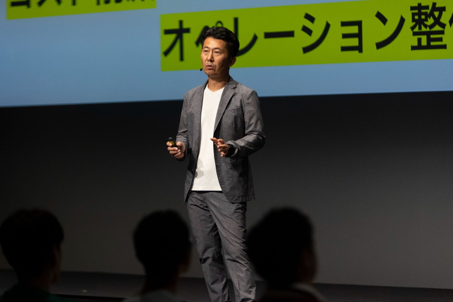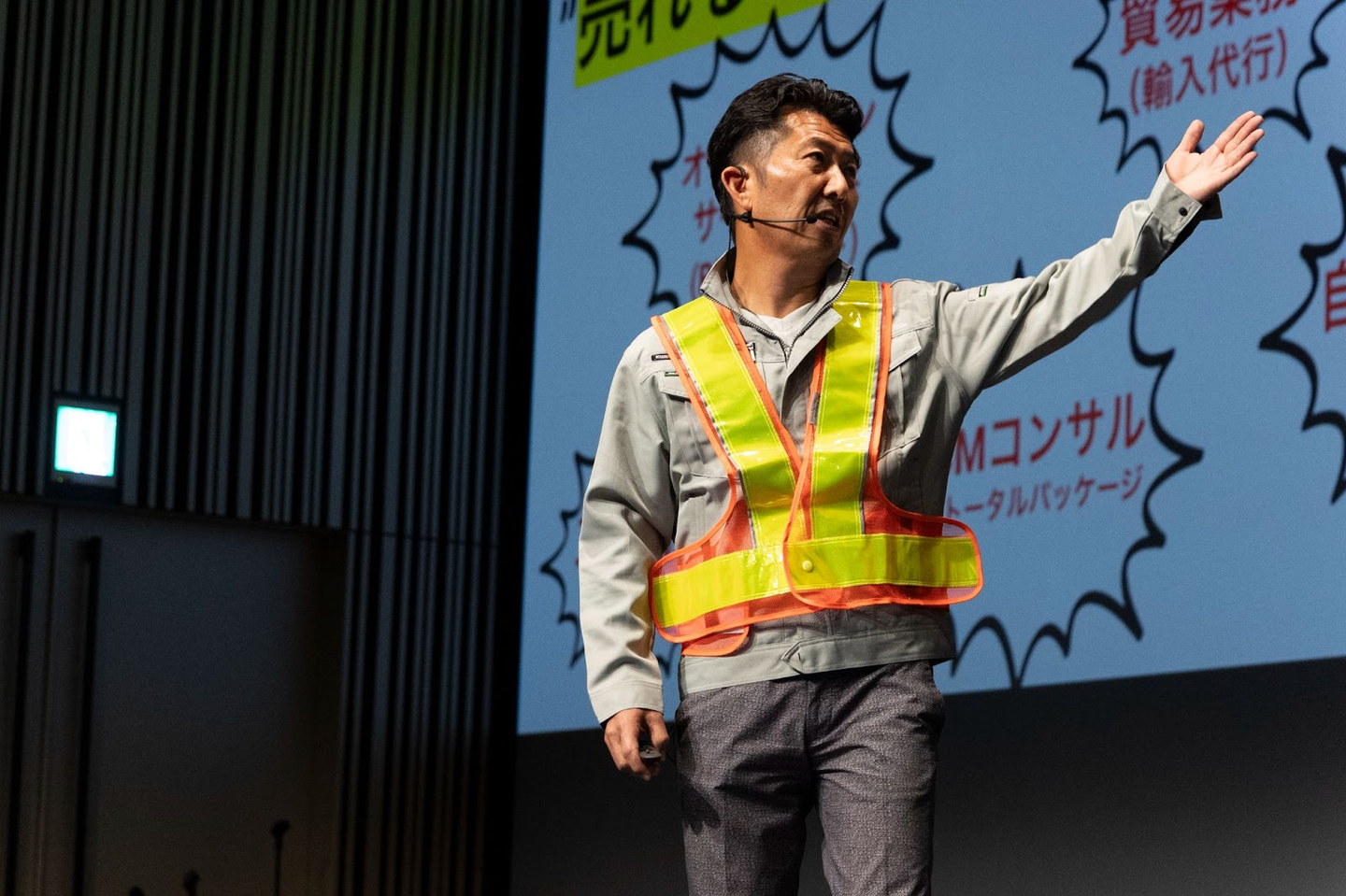 <執行役員/CSCO(Chief Supply Chain Officer) Kenta-san:プレゼンの途中で動画が流れたと思ったら、その間に衣装チェンジ!物流っぽい服装で登場>