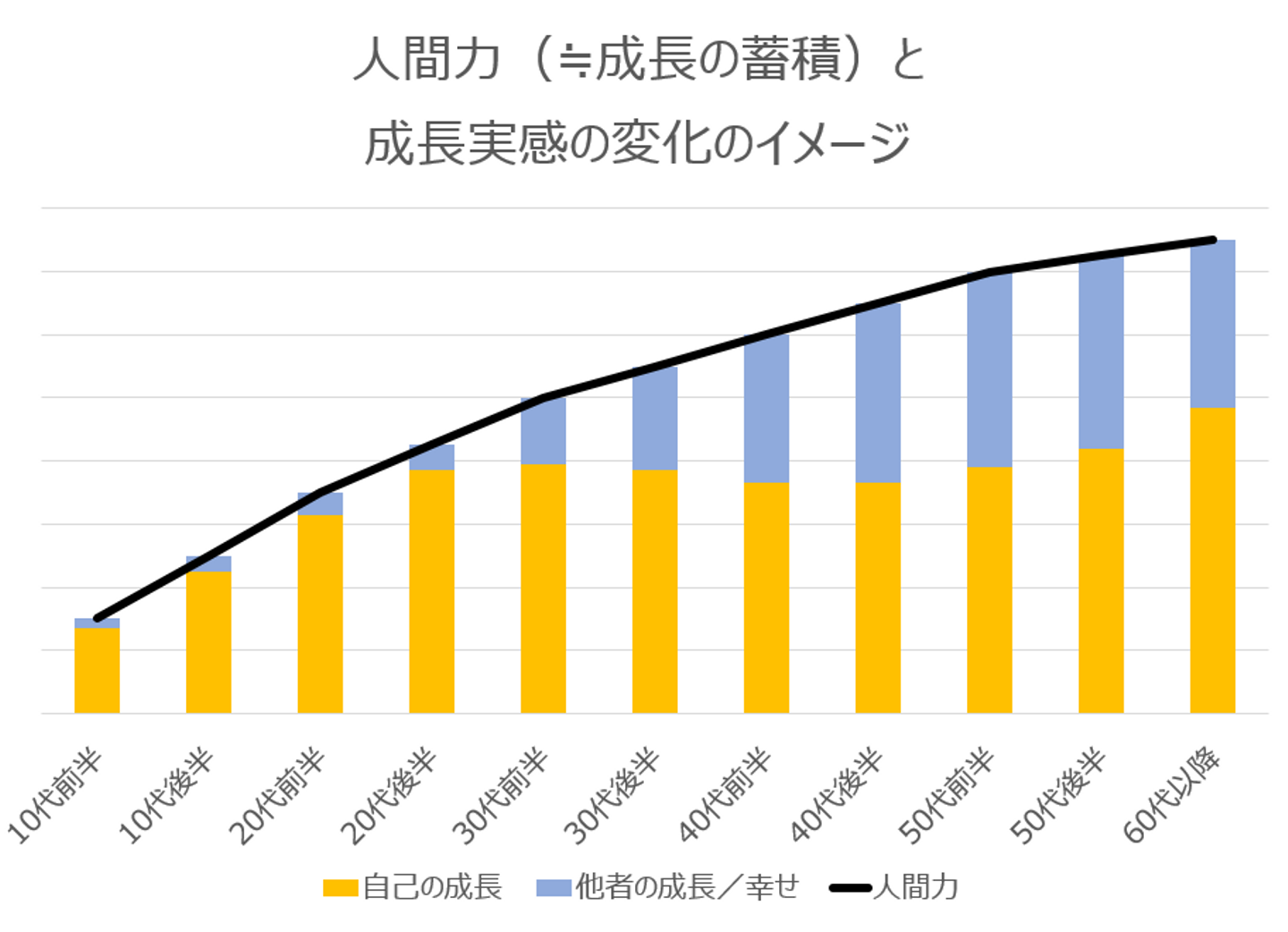 ※30代に入る頃から、他人の成長や幸せを自分の成長や幸せに感じることがより多くなり、60歳頃からは再び自身の成長(内省)を意識するようになっていくのではないか、というひとつの仮説です。