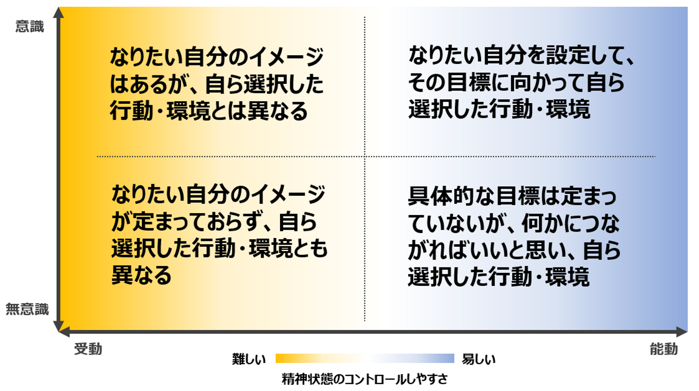 以下は、「成長のタイミング」の視点をマトリックスで整理してみたものです。自ら成長の機会をつくり出していくことで、自分の得たい成長や環境を得やすくなり、精神状態が安定するのではないかと考えました。