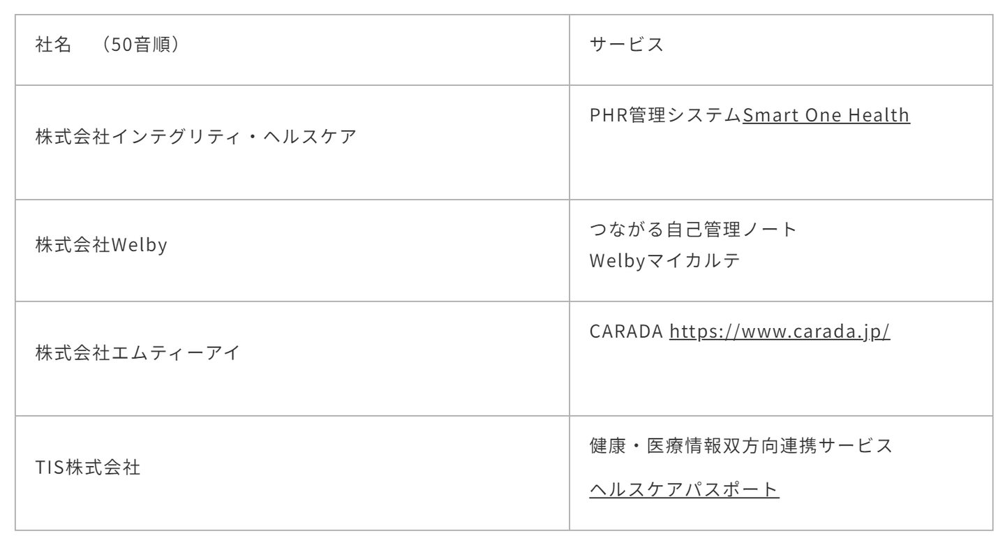 株式会社インテグリティ・ヘルスケア(代表取締役社長:園田 愛、本社:東京都中央区)、株式会社Welby(代表取締役 ⽐⽊ 武、山本 武、本社:東京都中央区)、株式会社エムティーアイ(代表取締役社長 前多 俊宏、本社:東京都新宿区)、TIS株式会社(代表取締役社長 岡本安史、本社:東京都新宿区)は、経済産業省 令和5年度ヘルスケア産業基盤高度化推進事業(PHR利活用推進等に向けたモデル実証事業)における「PHRの医療機関連携に向けたデータ標準化実証事業」として、事業テーマ「PHRデータの流通に向けた標準仕様のプロトタイプ検証と課題精査」が採択され、以下4社4サービスにて連携して検証を進めることを発表します。