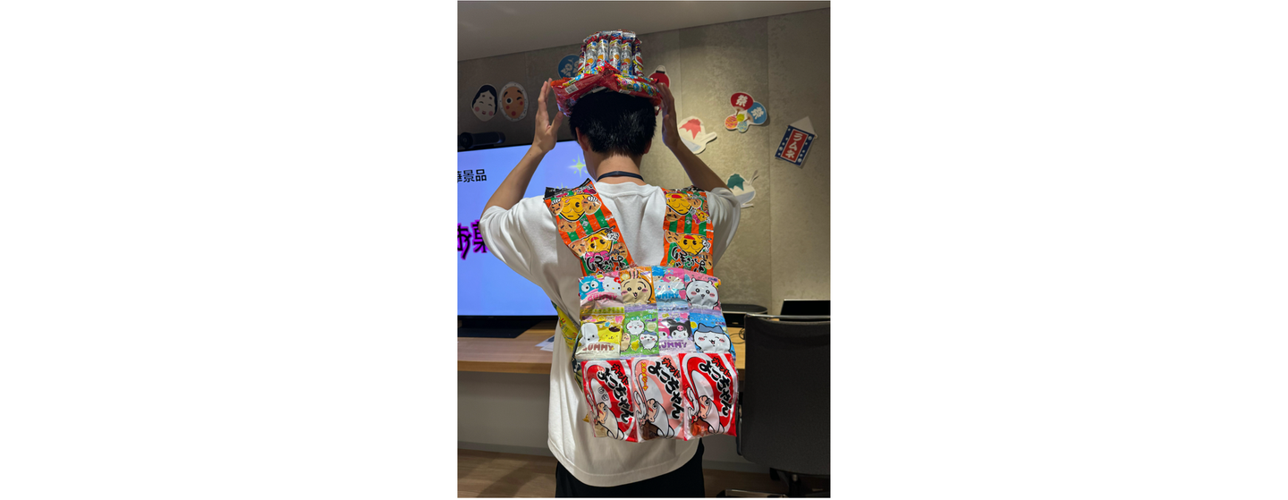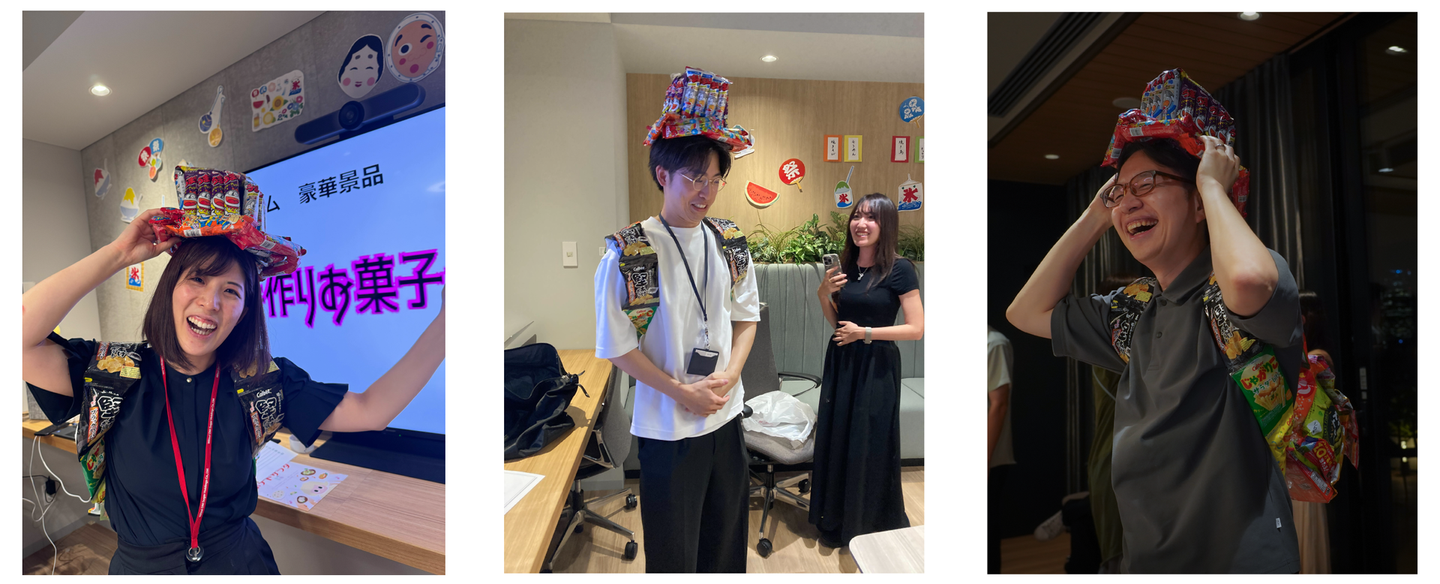 うまい棒をはじめ数多のお菓子で組み立てられたハットとリュック(どうなってるんだろう)を、笑顔でいただく優勝チーム。おめでとうございます!