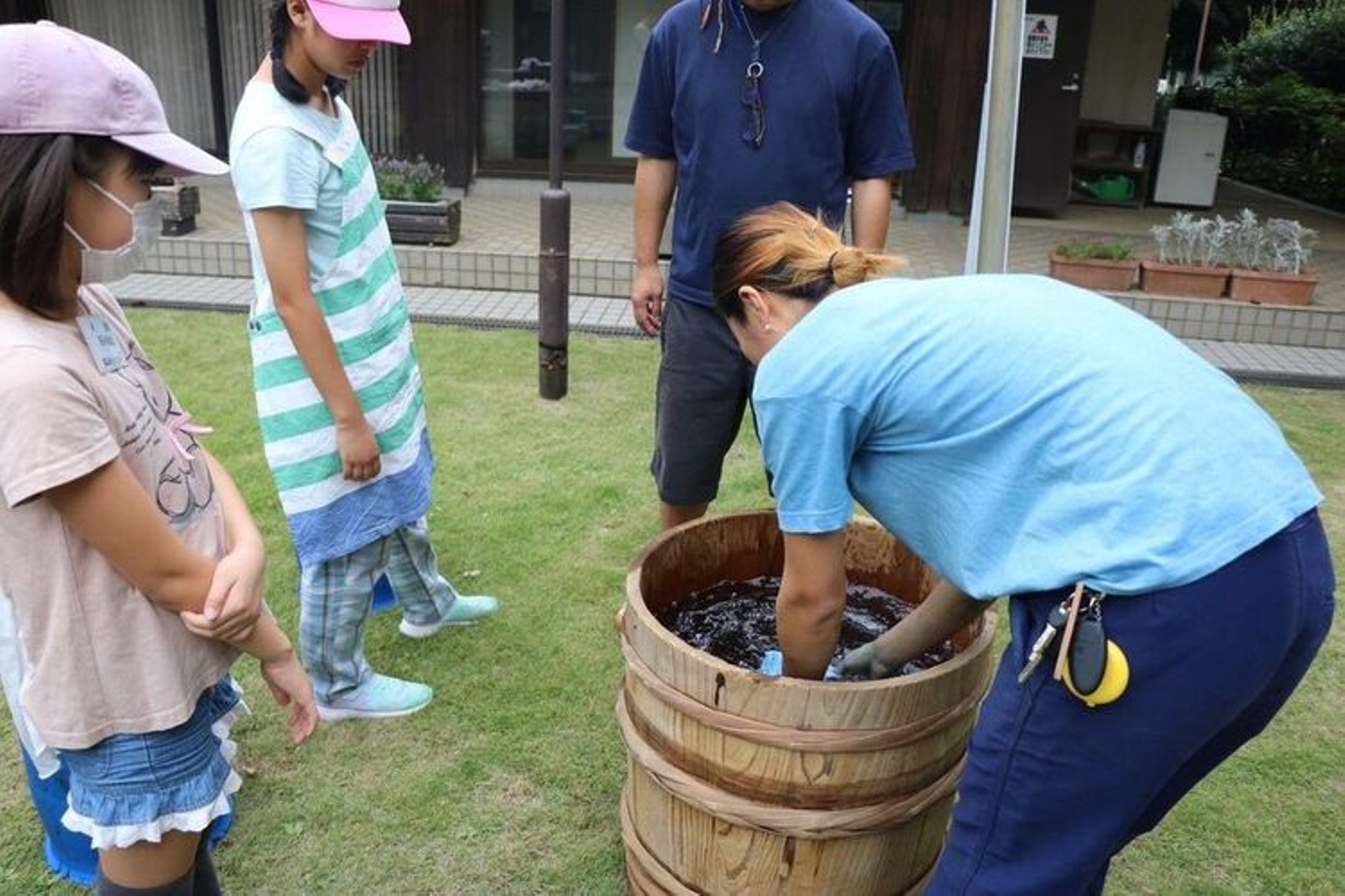 今回の藍染は、藍(あい)を発酵させて染め液を作りました。