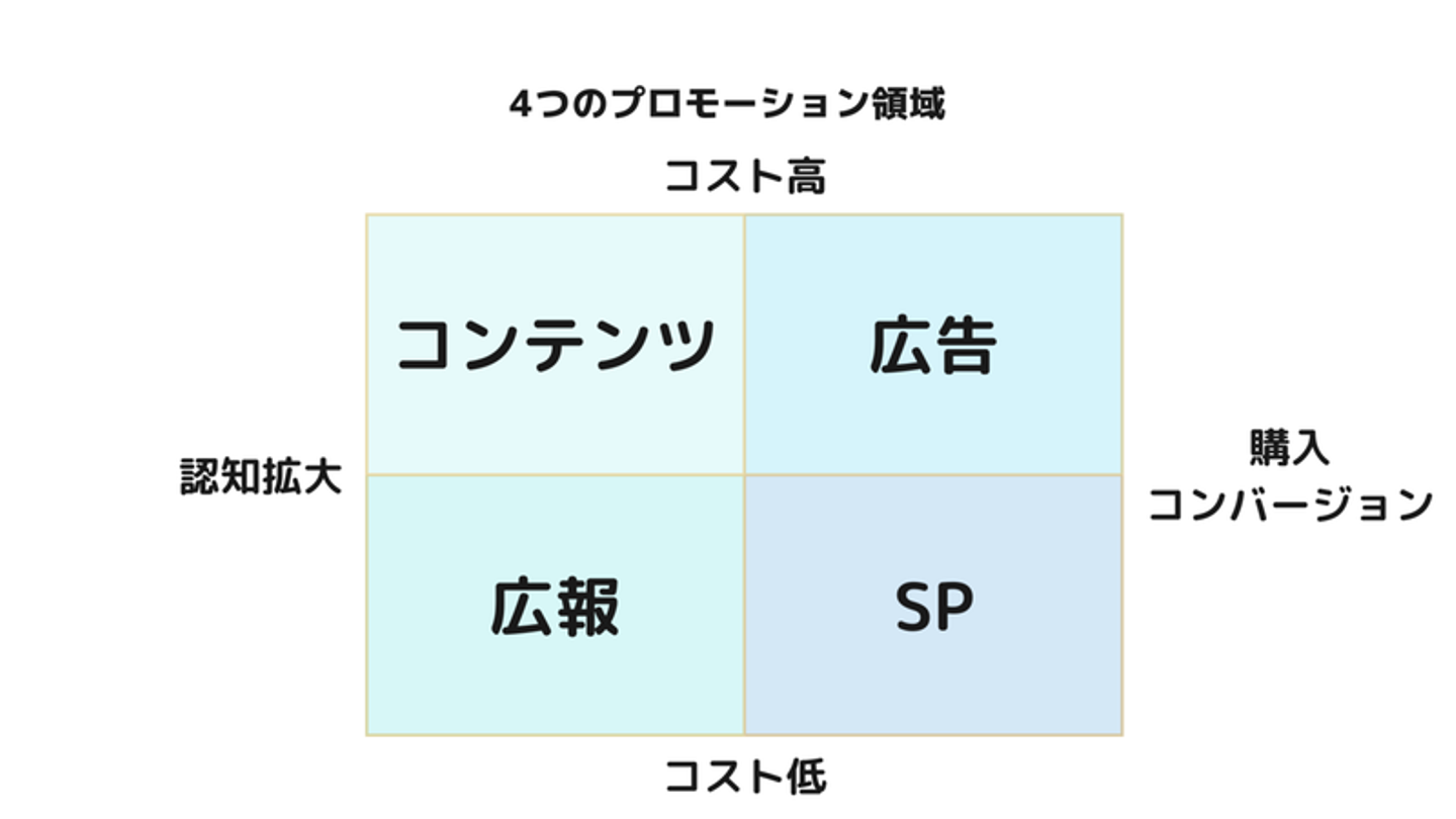次に、私たち『LOVECOSME』がプロモーション計画を立てる場合、これらの消費行動モデルをもとに『広告』『広報』『SP』『コンテンツ』の4つの領域から具体的な活動プランを展開させていきます。