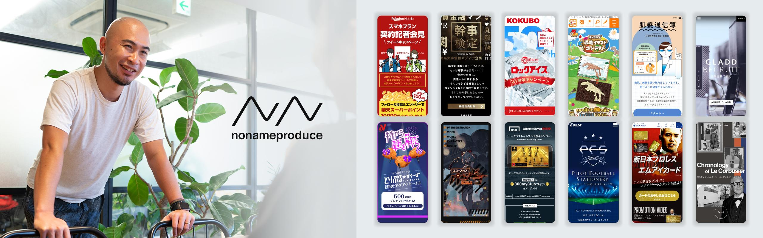 NONAME Produce(n2p)はWeb/SNSのキャンペーンを軸にした デジタルプロモーションの制作会社です。 デジタルとクリエイティブで「伝わる」を作ることで、 ユーザーに価値ある情報と体験を提供します。 2006年の設立からこれまで、Webサイト制作は勿論、プロモーション企画提案やSNSを活用したキャンペーンシステムの社内制作/運用を行っています。 私たちにとって、おもしろいことはあたりまえ。 おもしろい!の先へいくために常に考え、常に問いかけ続け、より良い答えを見つけます。