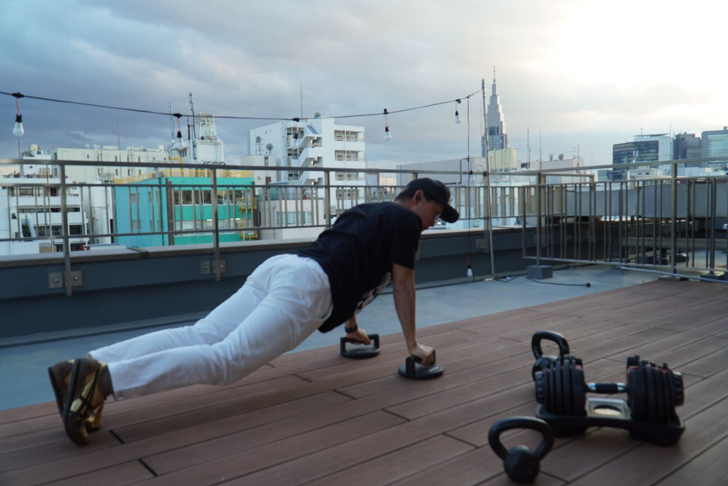 仕事で息が詰まったら気分転換できるベランダでは、気分転換に日光を浴びたり、筋トレをしたりと憩いの空間になっています。