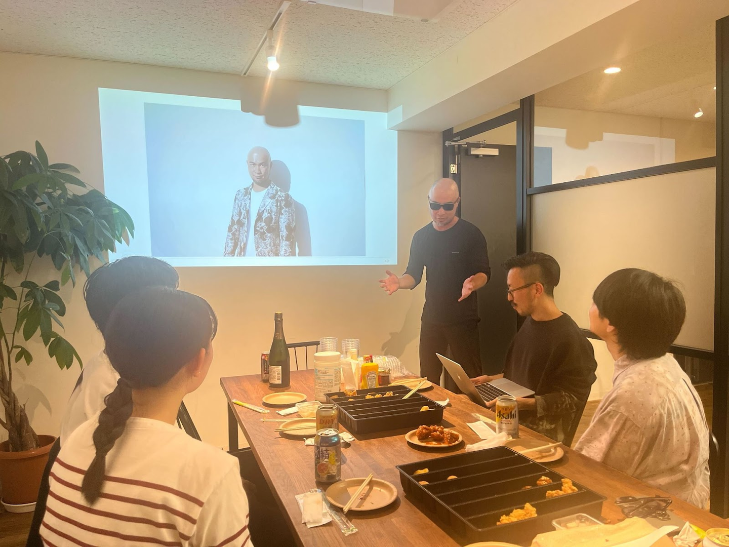 プロジェクターも完備しているので、大人数集まる際は白い壁に投影することも。リモートの社員ともMTGしやすいよう、マイク機能のあるスピーカーなども利用しています。(写真は月1でインターンと社員が集める社内イベントHANASHIBAの様子)