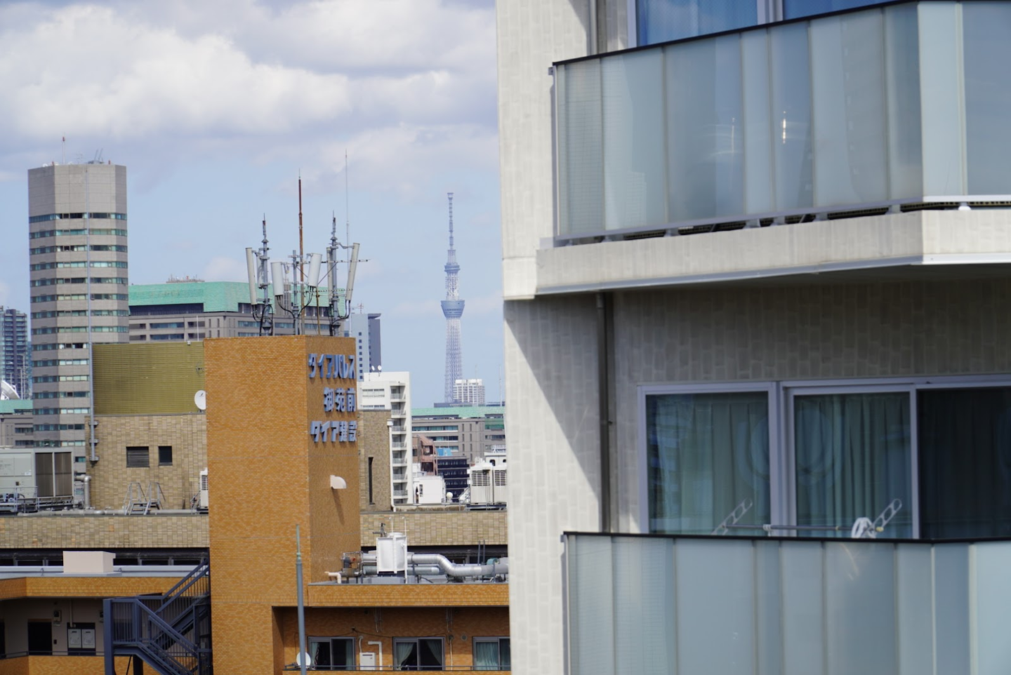 ベランダからは天気が良いとスカイツリーが見えます。ビルの最上階なので、比較的広々としたスペースで開放感は抜群です!