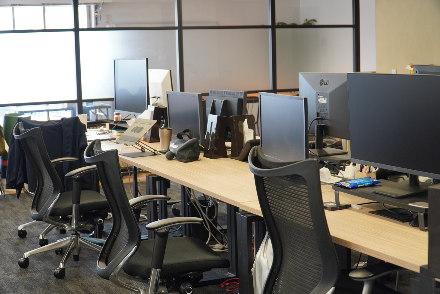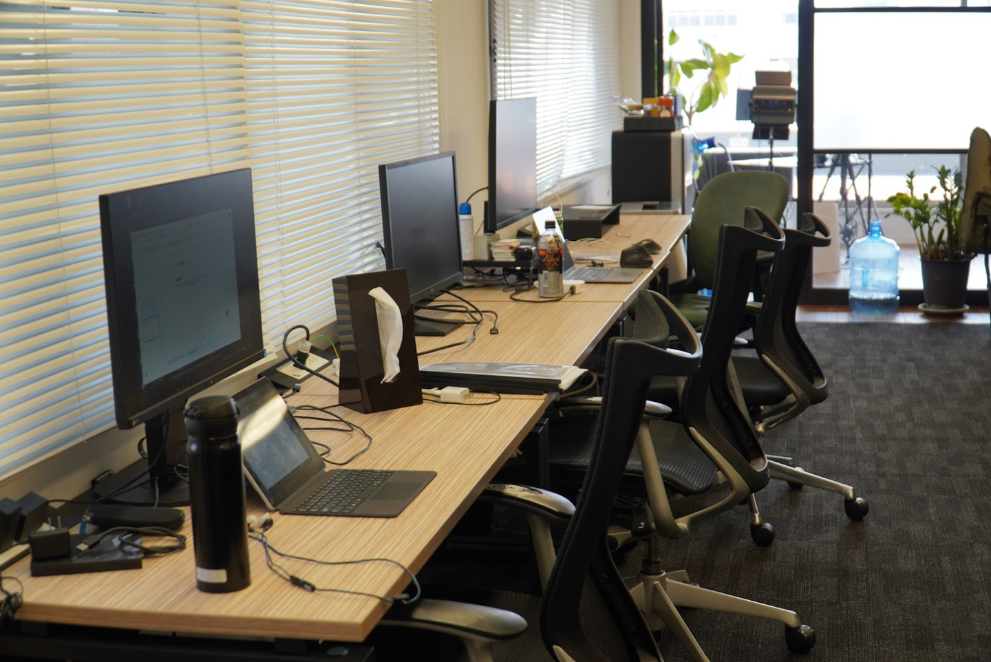 モニターがずらりと並ぶ執務室。n2pでは、リモートと出社の両方を使い分けできるよう、フリーアドレス制を採用。それぞれ好きな場所を選んで働けます。私は出社の方が集中できるのでほとんど出社していますが、社員によって出社頻度は自由。