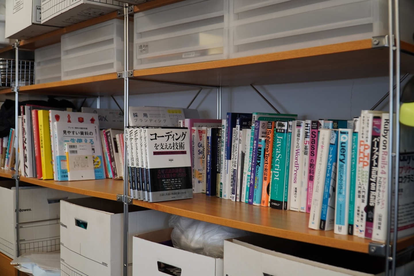 執務室内の本棚には、n2pの業務に関連する様々な本が収納されています。仕事の勉強になる本は会社の書籍補助から購入が可能で、みんなの学びや参考が本棚に集約されています。私はデザインに行き詰まった時に、本棚から数冊取り出してパラパラと見ることが多くあります。