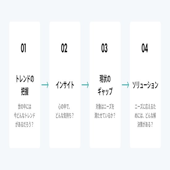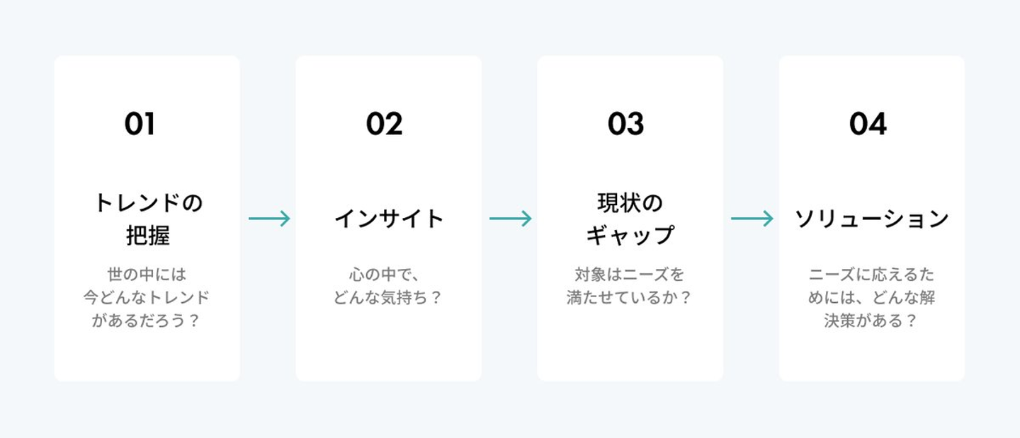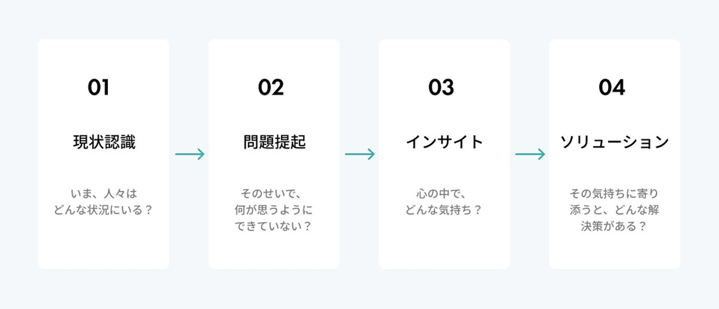 アイデア創出は「現状把握→課題分析→施策提案」という共通フレームに基づいて考えるのがスタンダードだと思います。