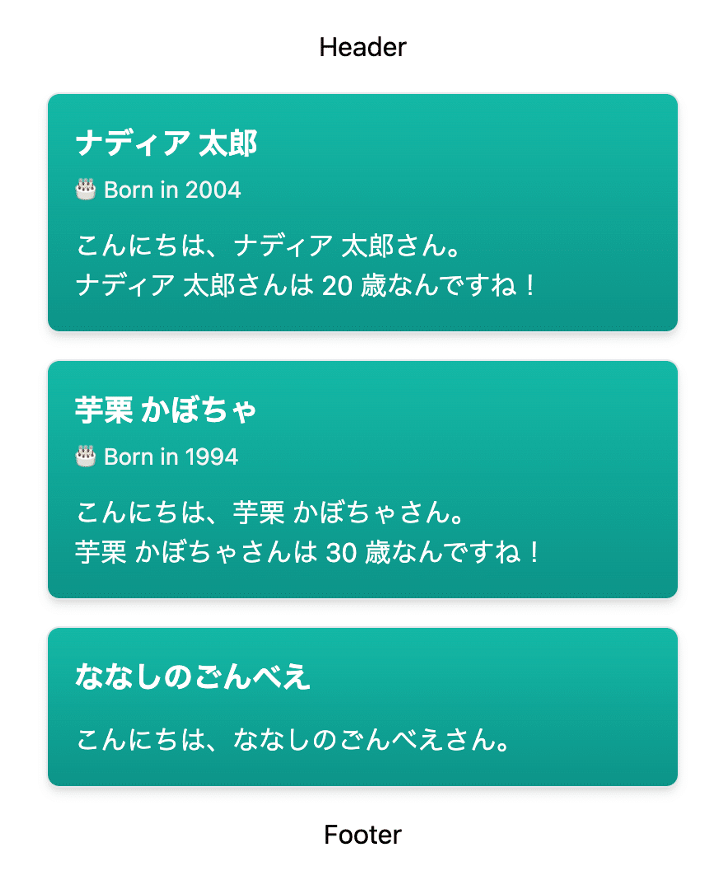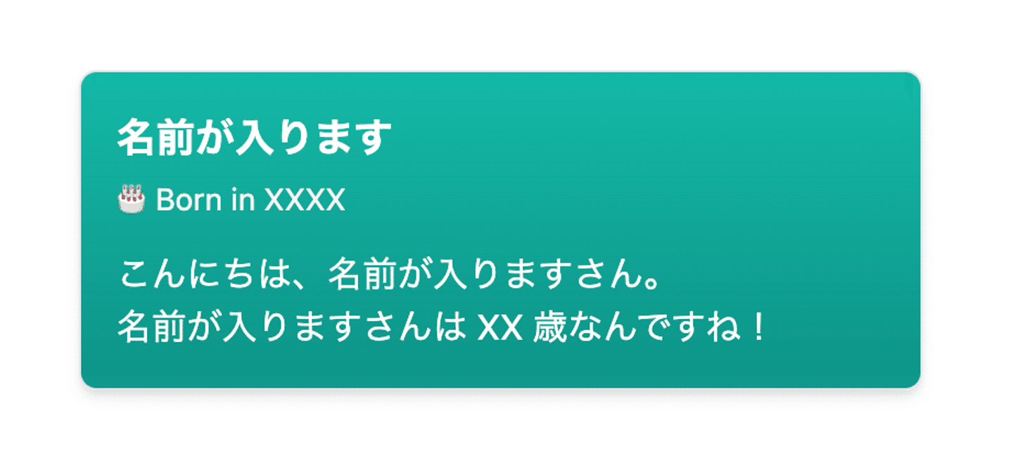 <GreetingCard name="ナディア 太郎" age={20} />