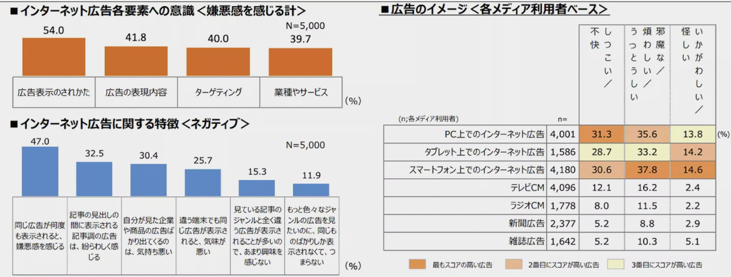 日本インタラクティブ広告協会(JIAA)の調査では「しつこい/不快」「邪魔な/煩わしい/うっとうしい」「いかがわしい/怪しい」という印象が、テレビなど他の広告に比べて最も多い数字を示している。