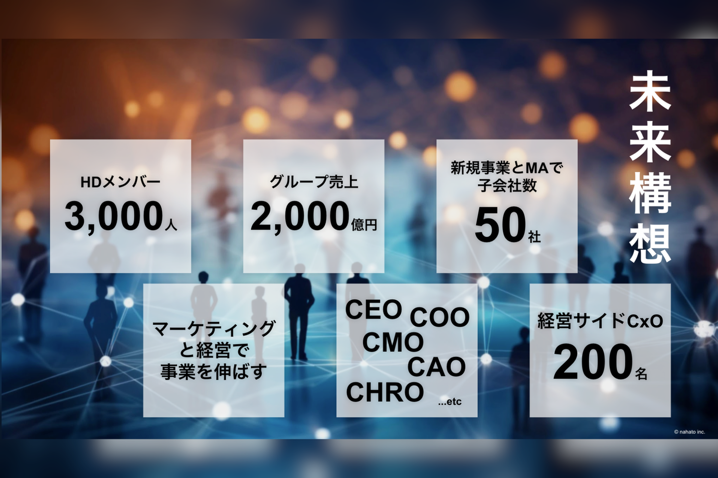 2024年現在、これまで数々の急成長を遂げてきたナハトは2040年までにメンバー数3,000人 グループ売上2,000億円という大きな目標に向かう 「第二創業期」に突入 しています。