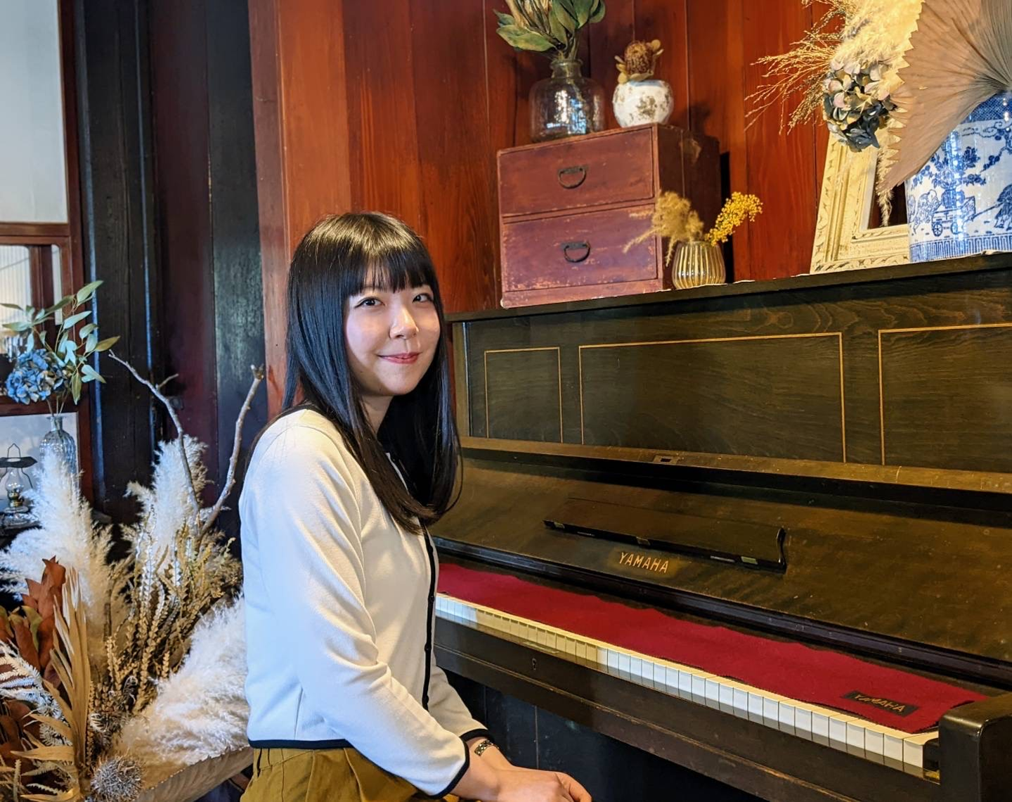 ピアノの前で撮影する西澤さん
