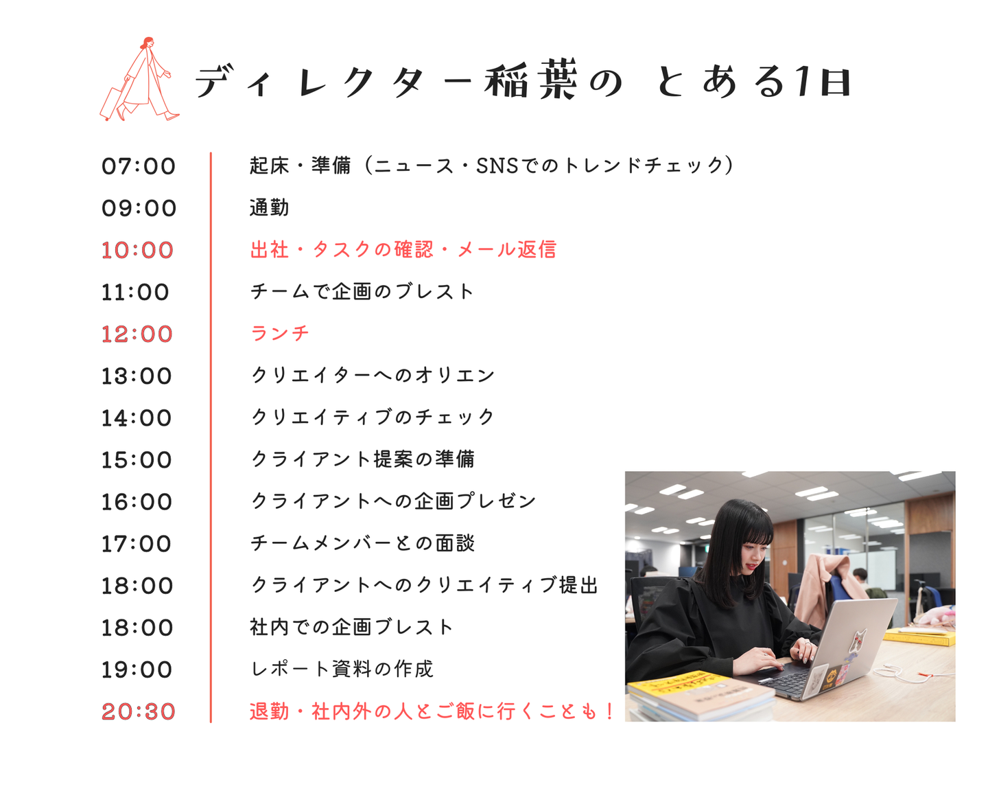 今回は、ディレクションチームのリーダーとして活躍する稲葉に、1日のスケジュールと仕事内容についてインタビューをしました。