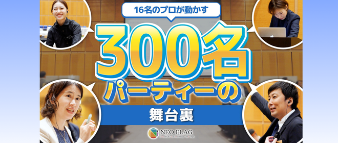 「今日は、300名規模の企業イベントです。」そう聞いて、あなたはどんな一日を想像しますか。NEO FLAG.の一日は、「ワクワクしますね」という一言から、静かに始まります。この日私たちが担当したのは、企業様の全体会議後に行われる約300名規模の懇親会。一見すると華やかなパーティー。でもその裏側では、想像以上に多くの判断と連携が同時に動いています。大事なのは、「一個ずつ潰していくこと」人が一斉に動く現場では、感覚や勢いだけでは絶対に運営できません。誰が、どこを、いつ担当するのか。今どこまで進んでいて、次に何が起きるのか。NEO FLAG.の現場では、役割を明確に分け、進行を“見える化”しな...