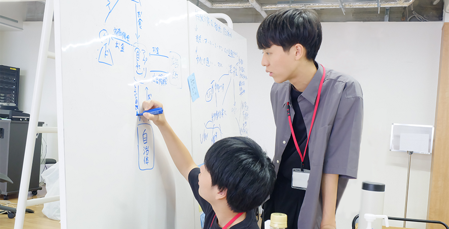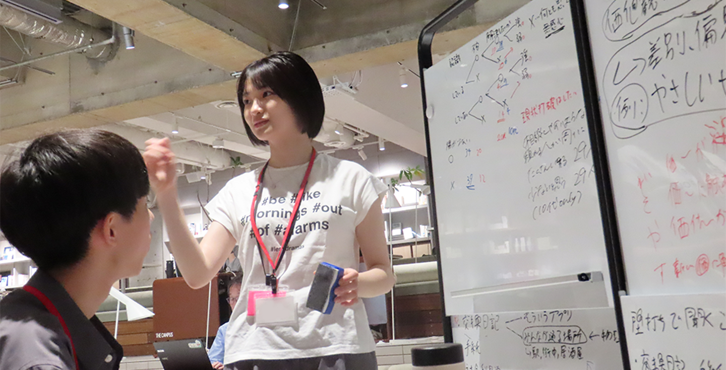 時間が経つにつれて焦りも出始めますが、それでもチームメンバー一人ひとりが納得できるようなアウトプットを出さないと、インターンシップに参加した意味がない。参加者たちはそう再確認し、自分たちが本当に納得できるアウトプットづくりに向けて再スタートを切ります。より意見を言いやすいようにとチームメンバーと1対1で自己開示をしあったり、個人で理想の社会を考え直す時間をとったりと、チームによって方法はさまざまですが、チームメンバー全員で理想を描くための土台を再構築し始めました。チームの志が一つになったところで、最終発表に向けて一気に走りぬけます。長いようで短い2日間。時間を有効に使えるように、タイマーを使ったり、他のチームに意見を聞いたりしながら、最終プレゼンに向けて、議論を練り上げます。
