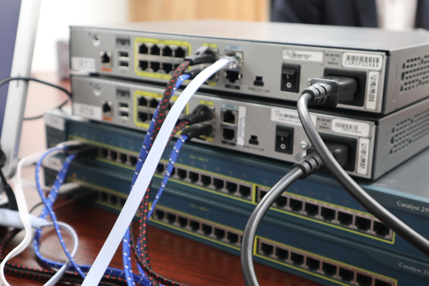 CCNA研修では、写真のようにケーブルの結線も研修生にチャレンジしていただき