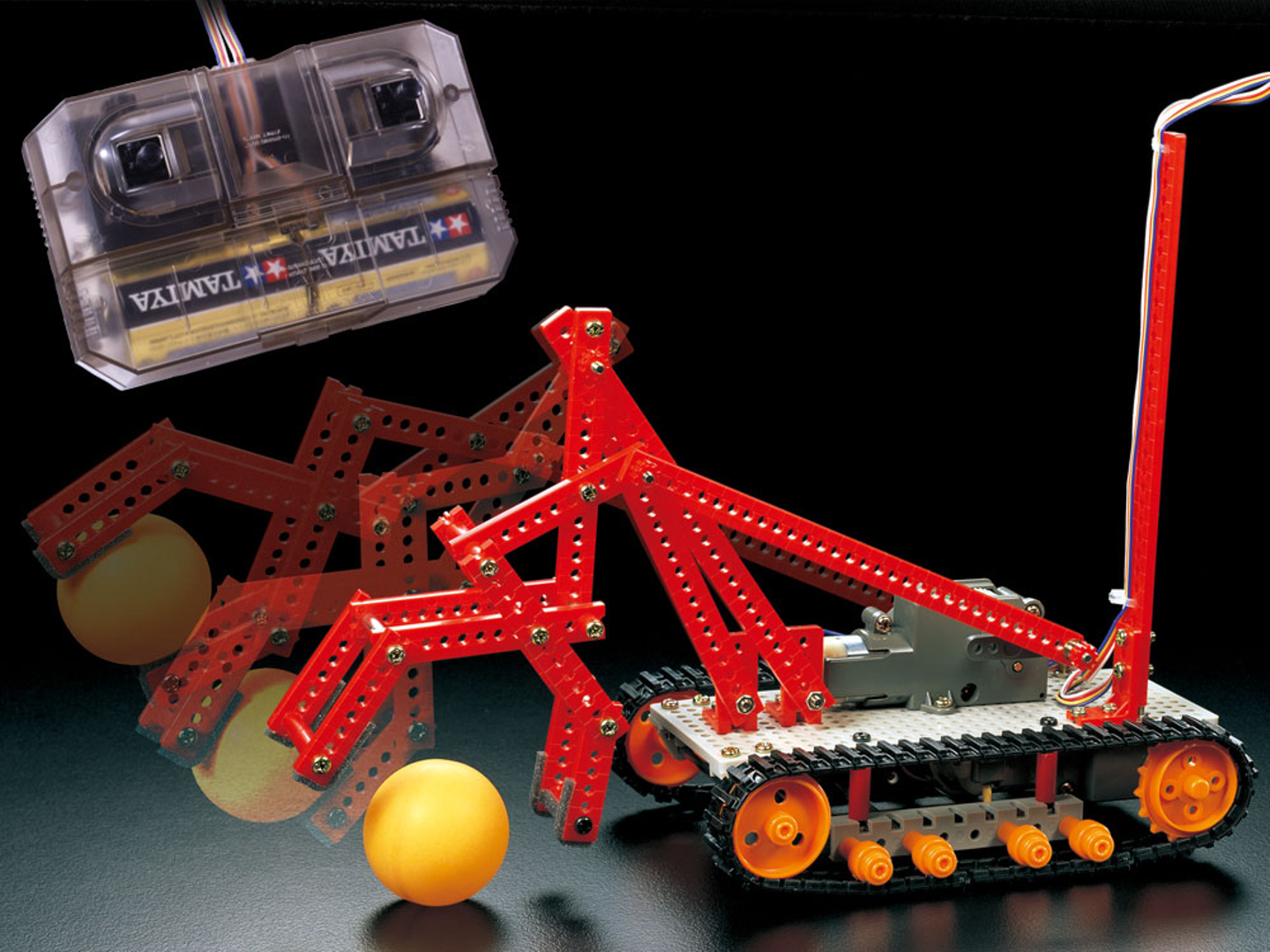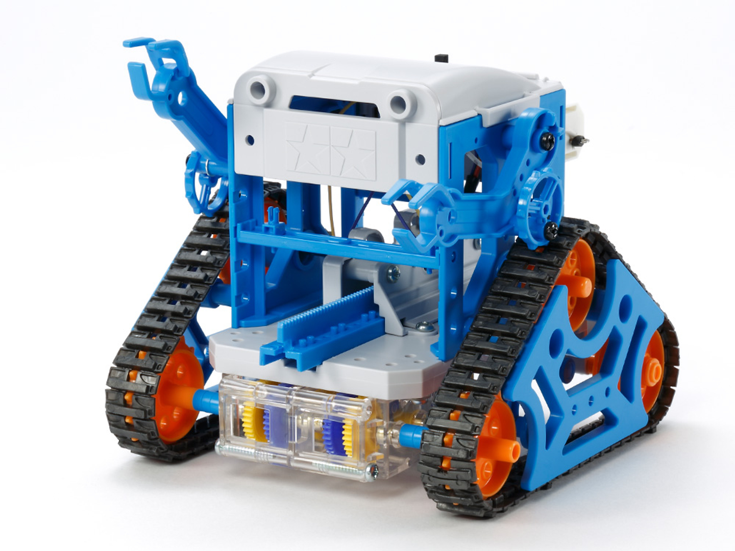 三角形のクローラーの足、ツメのある腕をそれぞれモーターで動かすことのできるロボットです。