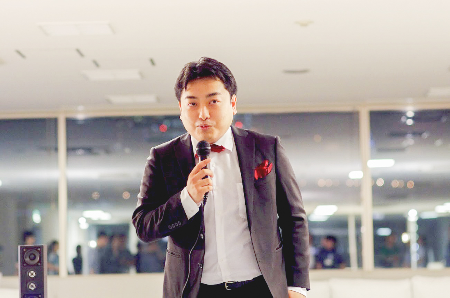 納会の司会をする様子。意欲次第で実践の場が与えられます(笑)。