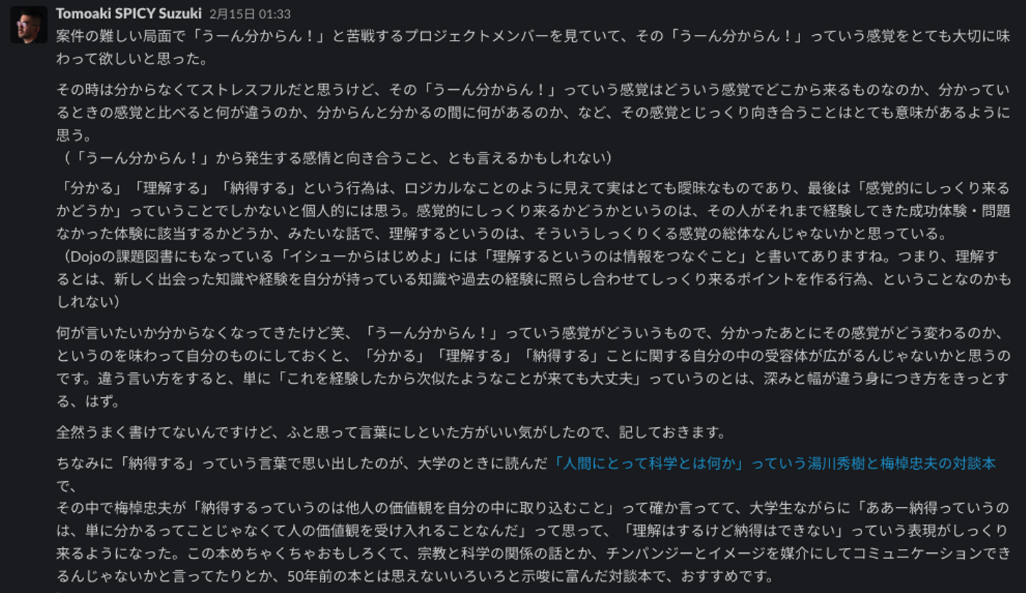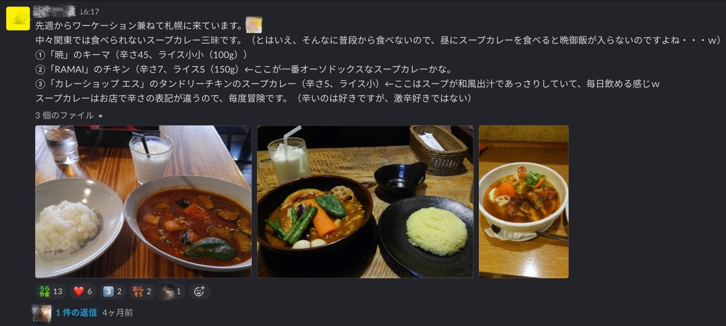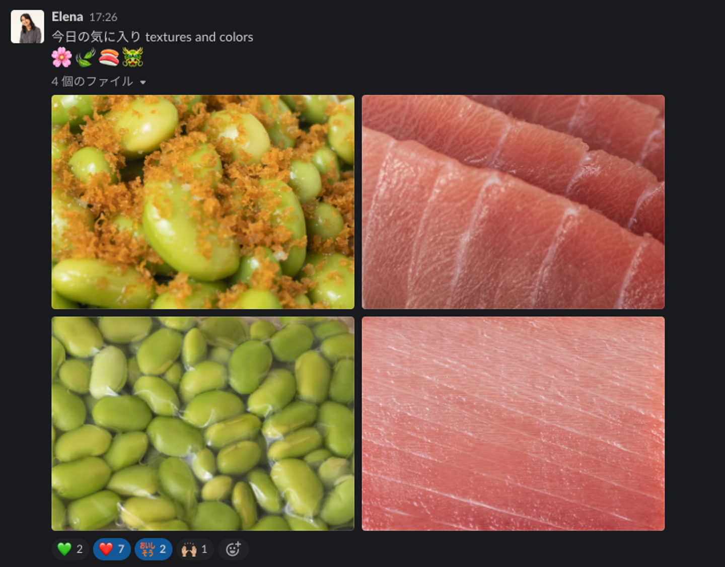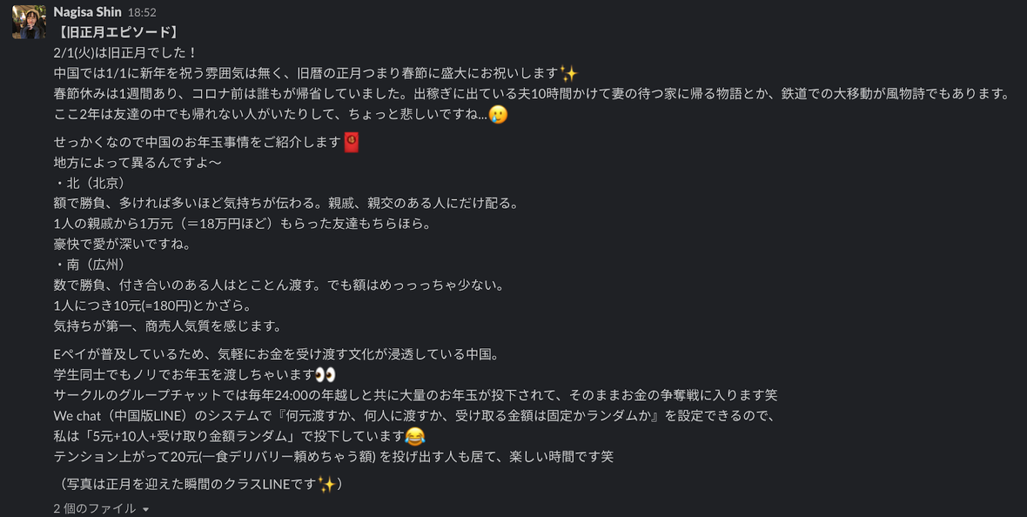 (私が興味を持っていることで、他の社員たちも興味を持ちそうなことを投稿しています。日本語学校に入ったばかりの頃は、日本語の勉強についてシェアすると、チャンネルに居る同僚が助けてくれました。)