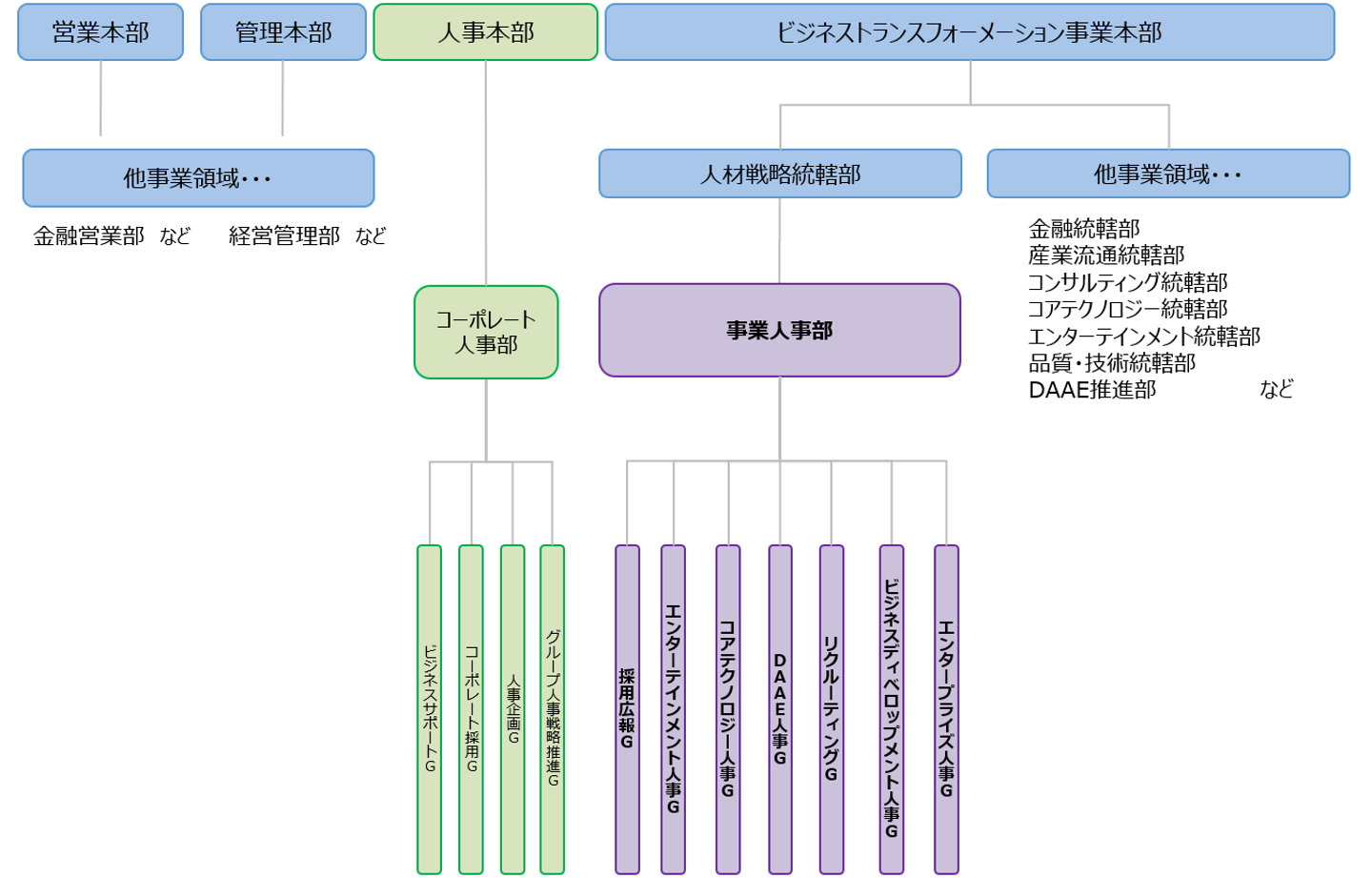 人事本部、いわゆる本社人事機能だけだと事業のことを深く知るという組織にならないから、事業人事は、各人事領域の専門家という意味合いが強い人事本部の人たちと、事業部との間に位置づけられているよね。
