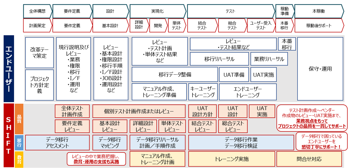 そのため、当初の期待値はテスト支援のみでしたが、PMOやデータ移行の領域についても相談いただき提案を実施、参画させていただきました。