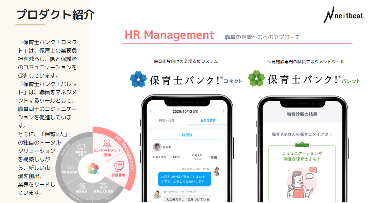 野木:「保育士バンク!コネクト」は、「保育業務の“タイヘン”を“カンタン”に」というテーマのもと、保育業務の負担軽減を目指すICTシステムです。また、「保育士バンク!パレット」は、保育士さんの特性や心情の変化などのデータ取得から、保育園が適切に保育士さんとコミュニケーションが取れるよう手助けし、定着やエンゲージメント向上に繋げるマネジメントツールです。