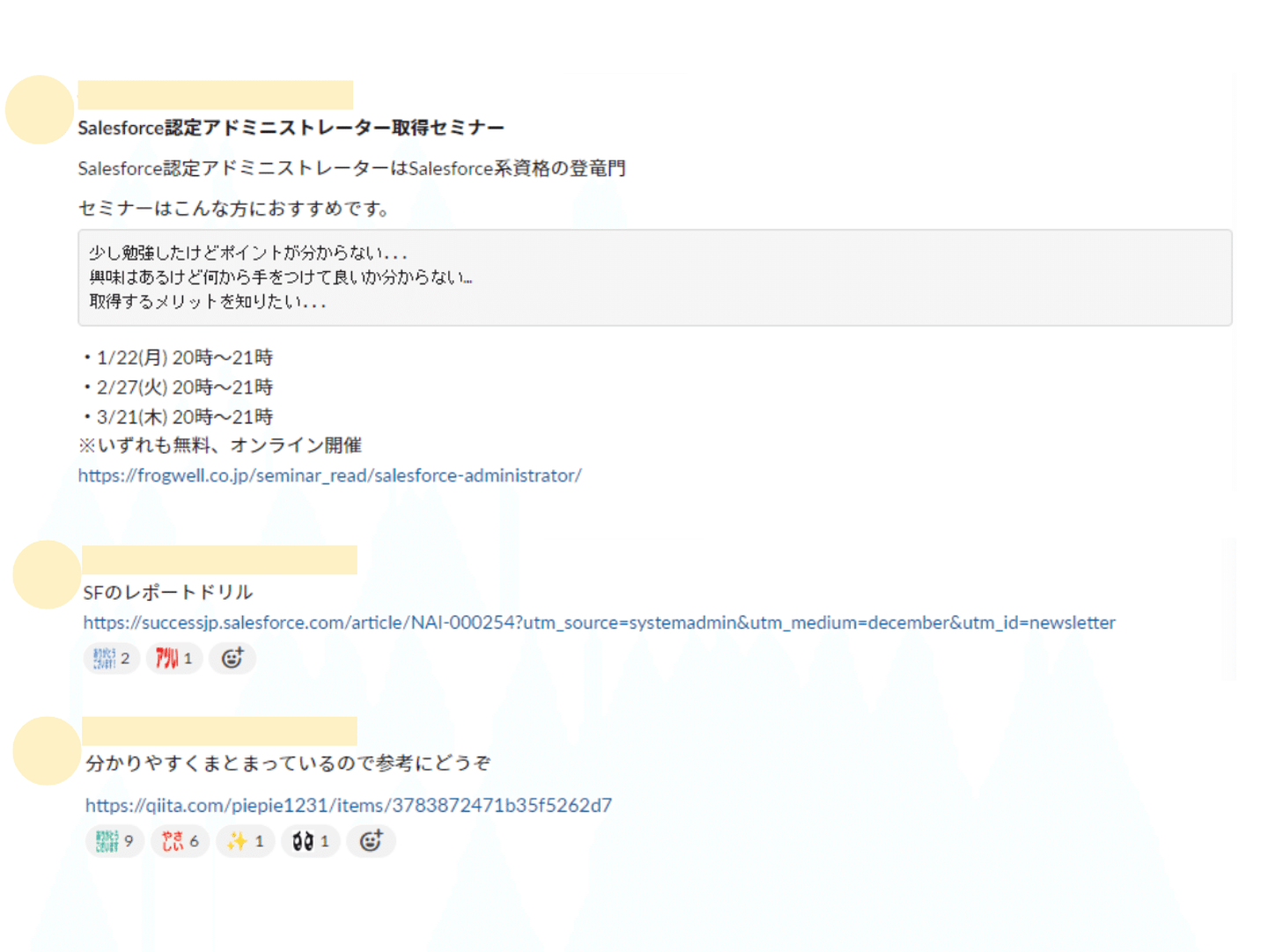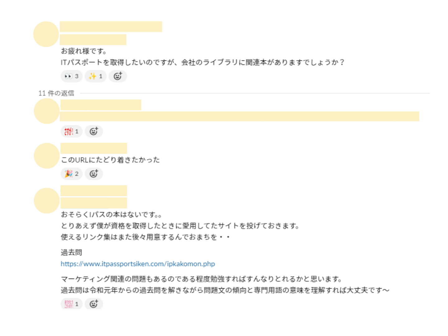 社内コミュニケーションツール(Slack)を使って、専門知識の高い部署のメンバーをはじめ、知見のあるクルーが「勉強方法が分からない...」「良い参考本はないか」などの質問に答えてくれます。