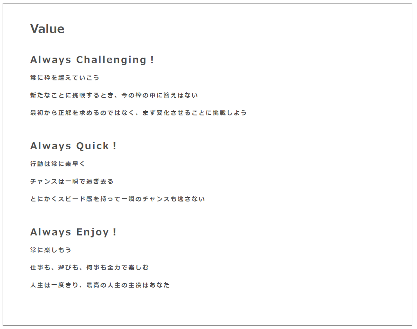 それはコーポレートサイトにもある3つのVALUEですね。