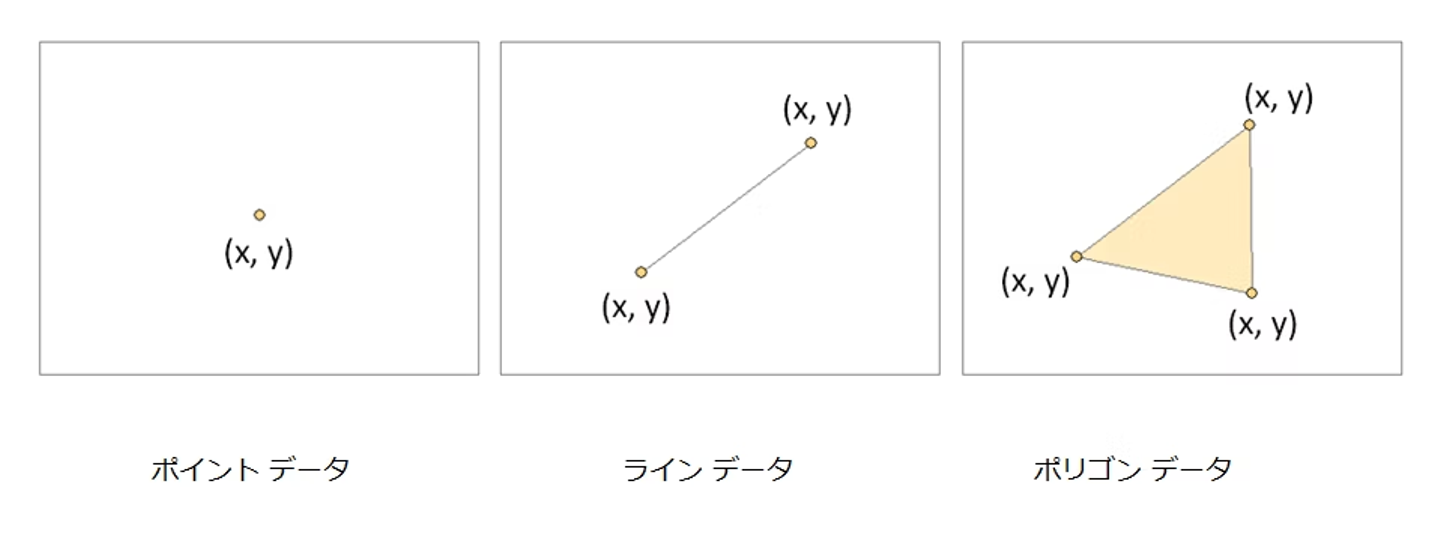 点(point)や線(Line)、面(Polygon)のいずれかで表現するベクターデータ(Vector data)と
