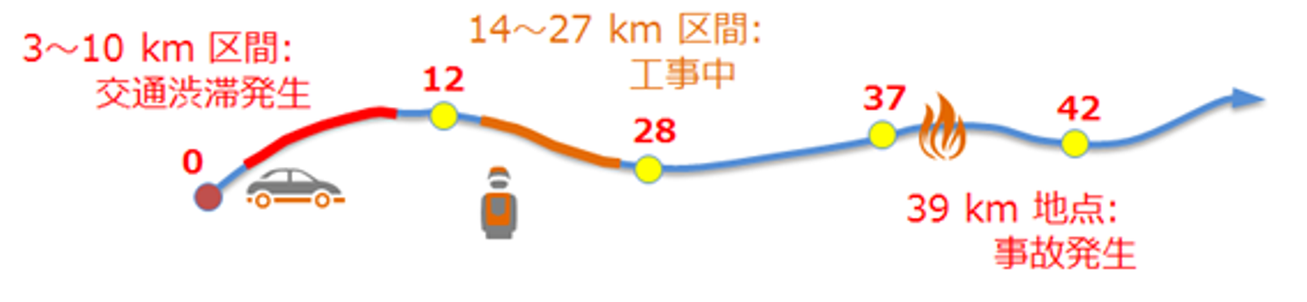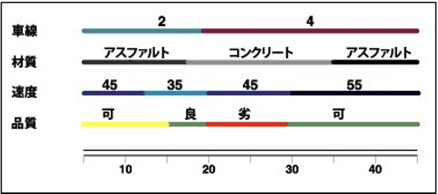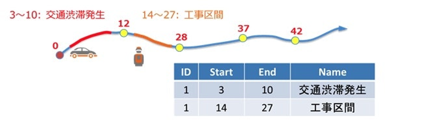 これらのイメージではベクターデータにおける線(Line)と変わらないように見えますが、下のイメージのように「3〜10キロ地点は渋滞発生中、14〜27キロ地点は工事中」といった形で、