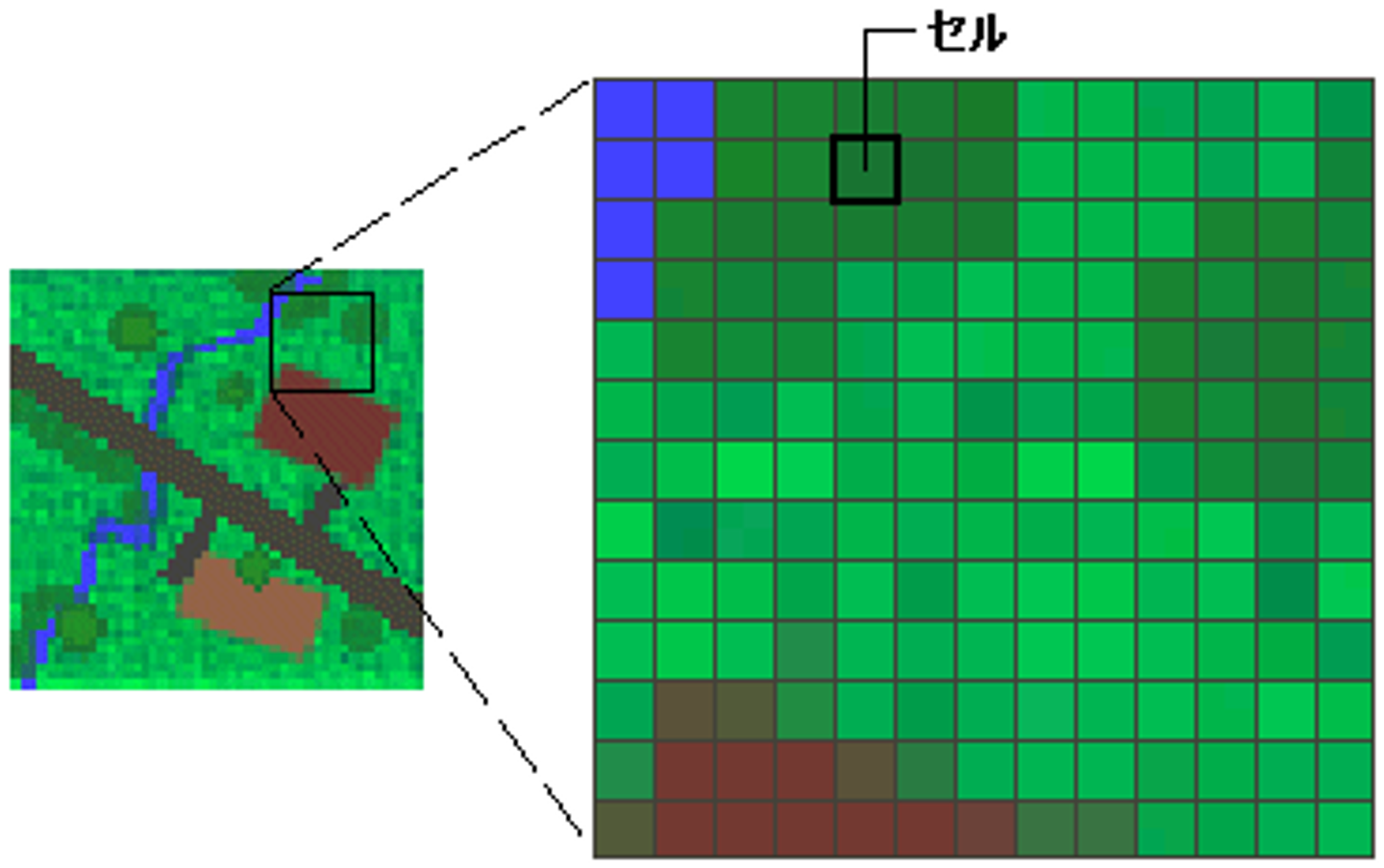行と列の格子状(グリッド)に並んだセルで構成される、リモートセンシングなどが代表的なラスターデータ(Raster data)