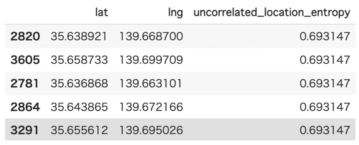 - id, lng, lat, random_location_entropyのカラムが出力されます。