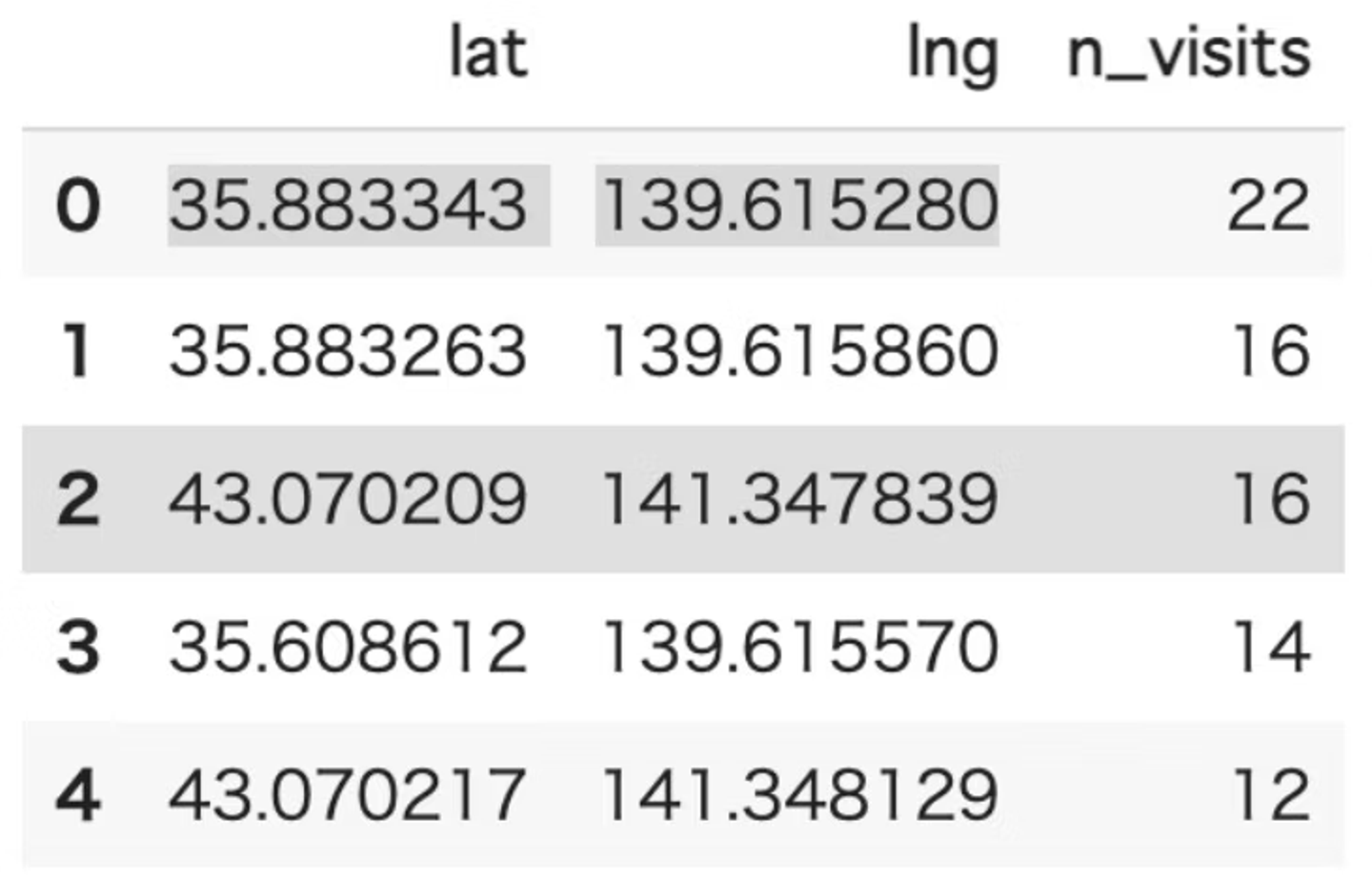- 訪問数(n_visits)の値で多くのユーザーが訪れた場所がわかります。