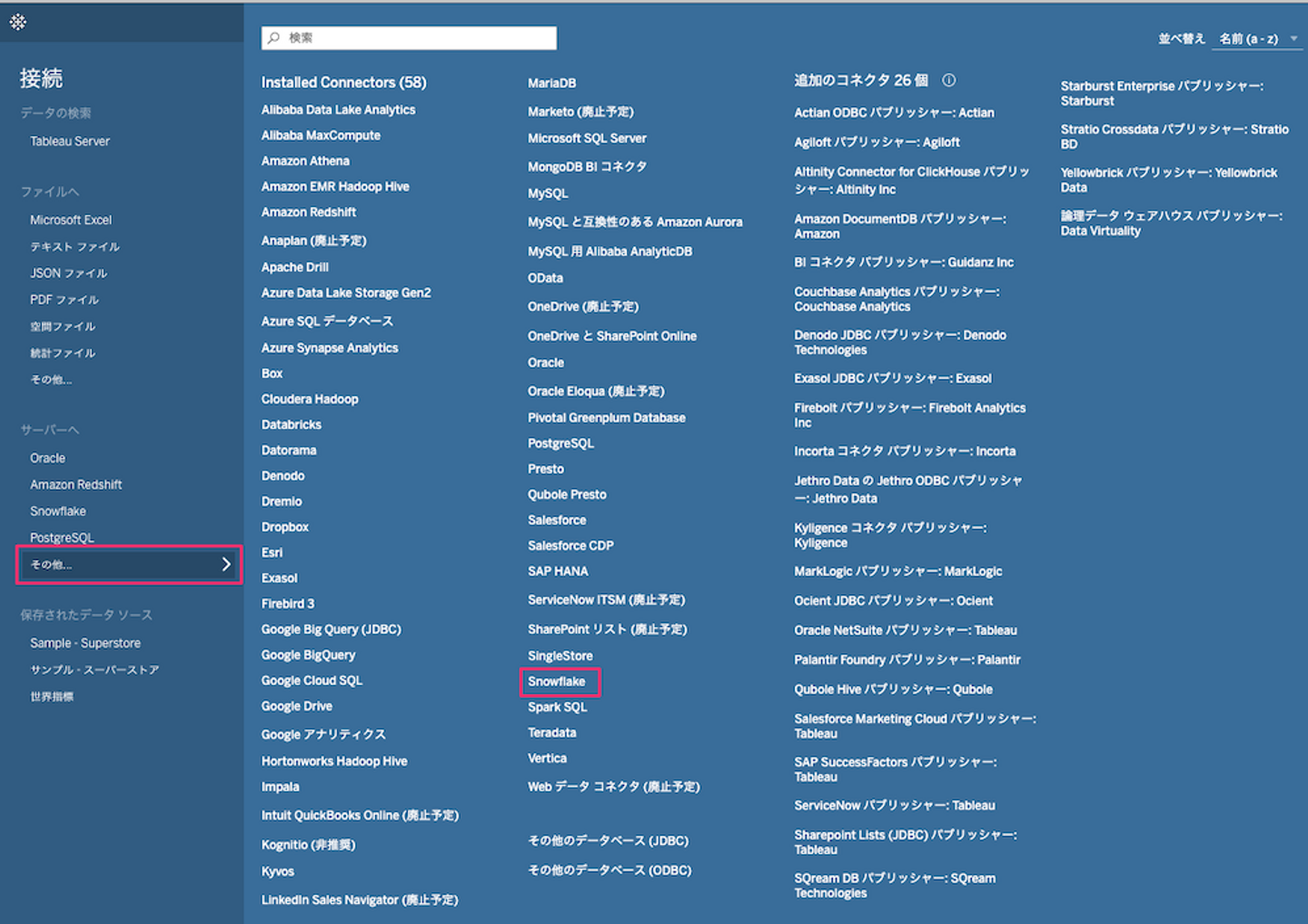 Tableauを立ち上げて、サーバーへのその他に進み、Snowflakeを選択します。