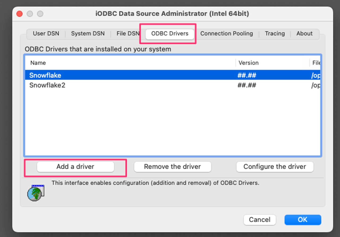 Mac用Snowflake ODBC ドライバーには iODBCが必要です。これは次からダウンロードできます。