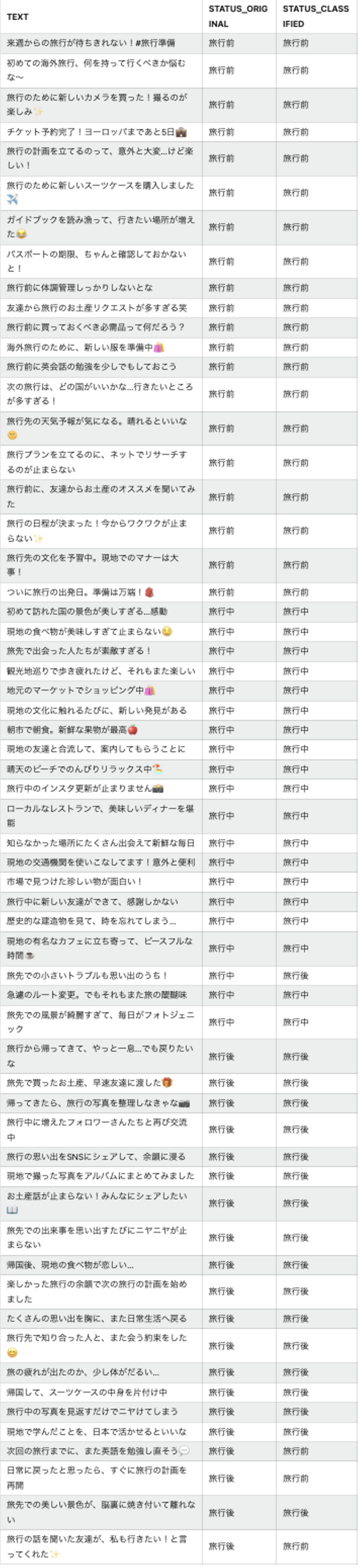次は、テキストの内容から「旅行前・旅行中・旅行後」の分類をしてみます。