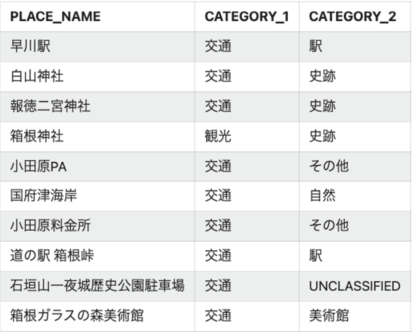まずは、分かりやすそうなテーマで、施設のカテゴリ(観光施設・食事処 等)を分類してみます。