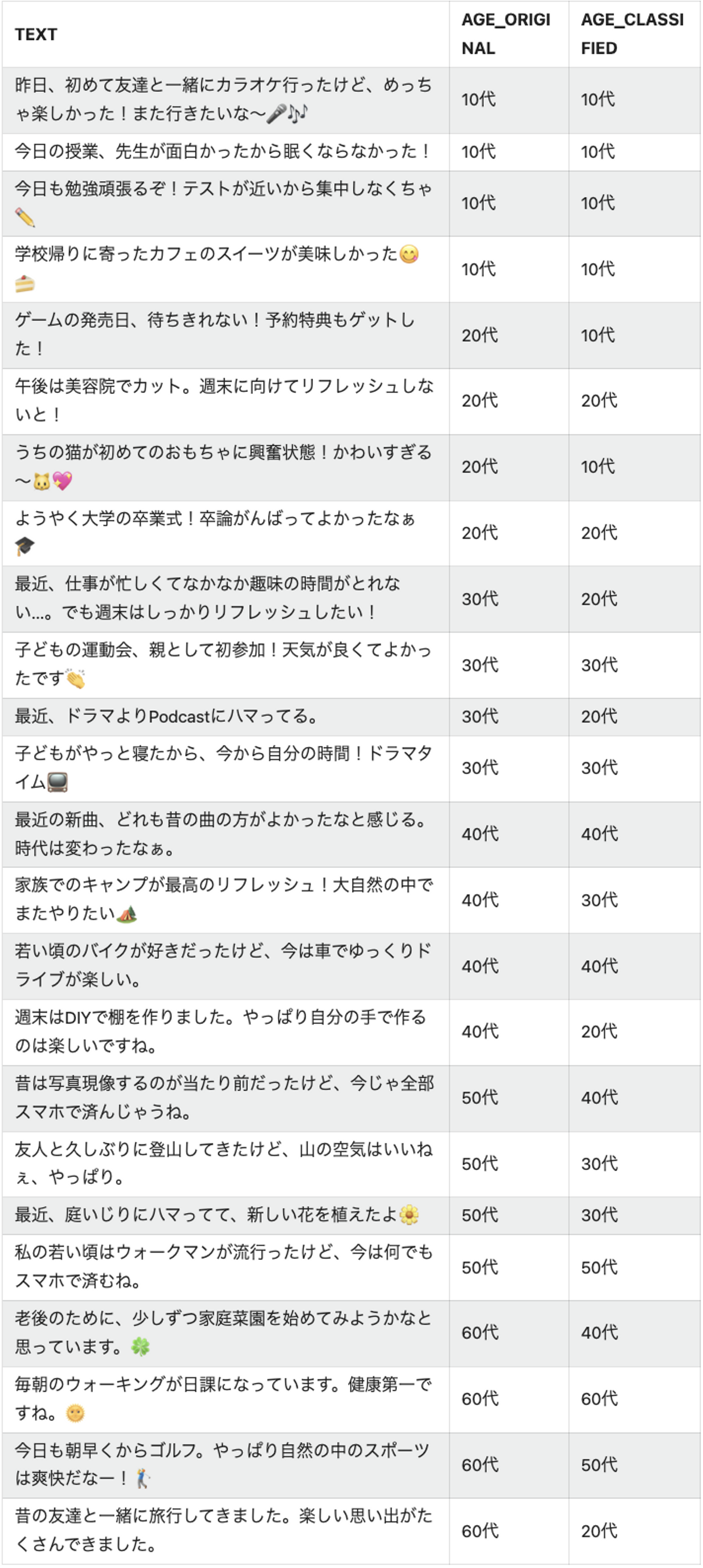 次は、テキストの内容から筆者の年齢層を分類してみます。