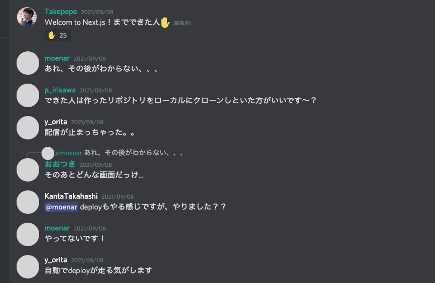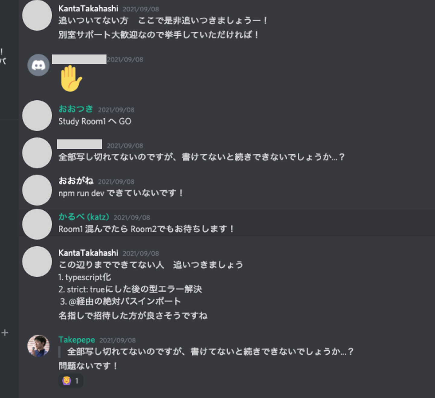 本格的であるが故にスピードも早く、着いて来られなくなる受講者も現れ始めます。しかし、そういった受講者を置いてけぼりにするようなことはなく、Next.jsの業務経験がある受講者が自主的に初学者のサポートに回る流れが見られました。
