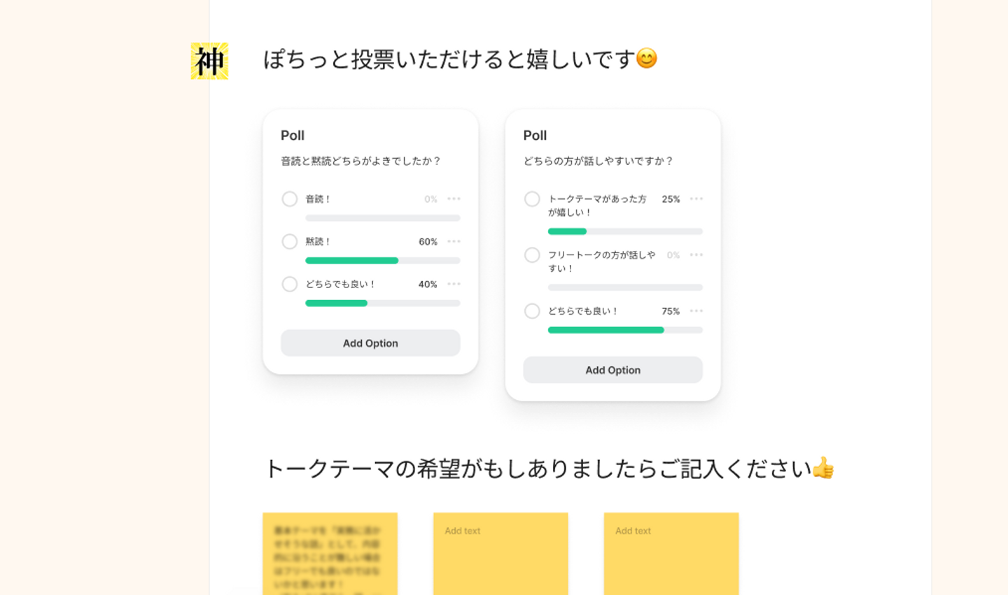 運営陣がとても熱心で、意見板と投票機能を使って参加者の意見を募集し、輪読会を継続的にブラッシュアップしています!