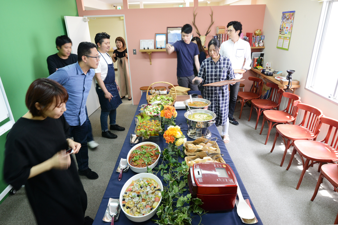 メニューは毎回シェフにお任せ!会議室に入ってきたメンバーが覗き込むように食事を見ています。ワクワク