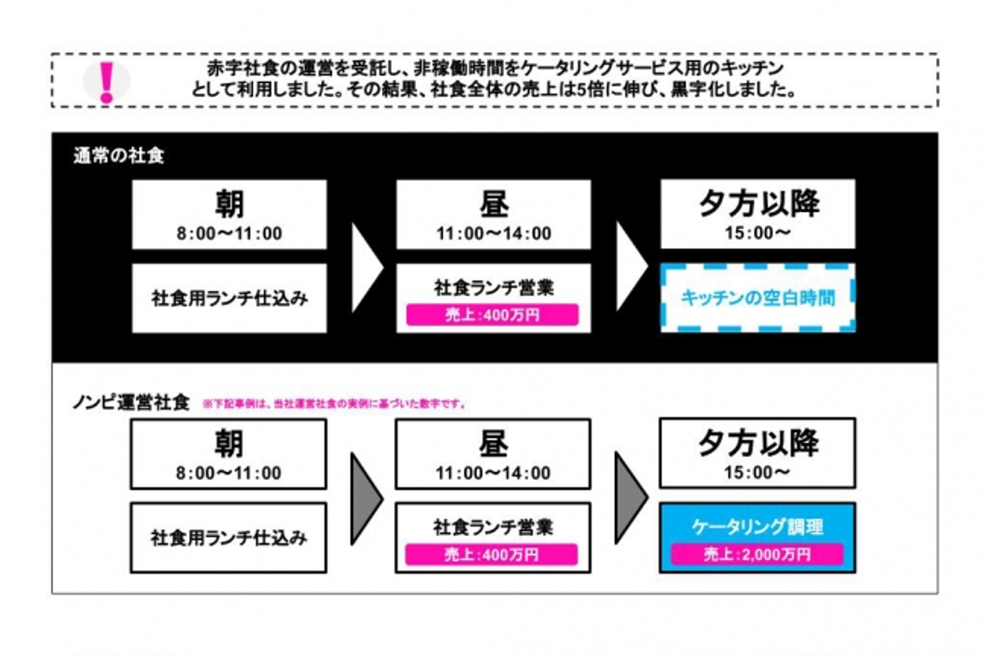 ノンピは、遊休資産となっている社員食堂を運営補填金なしで運営受託し、そのアイドルタイム等を利用し、周辺企業にランチやパーティーのケータリングサービスを提供します。同ビジネスモデルで運営する社員食堂は、通常のランチ売上の約5倍~10倍の売上を作り黒字化されています。
