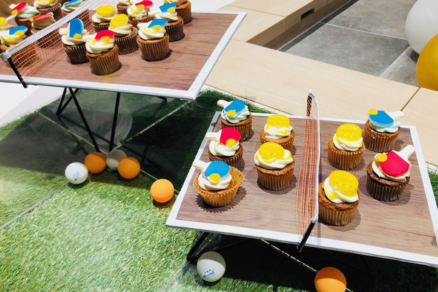 卓球大会を開催した企業さまへ、ラケットとピンポンを乗せたオリジナルカップケーキ