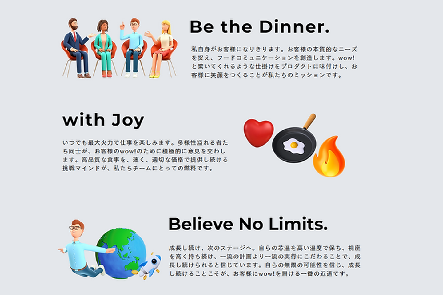 清水〉外食店舗とは違う社員食堂という概念は持ちつつも「美味しくしようとすることを諦めない」心を持って取り組める人がいいなと思います。原価300円で同じ商品を作るとしても、他社よりもノンピの方が美味しくなる!という自信を持ち、お客様の本質的なニーズを捉えていくことにこだわることのできる、そういうチームを作っていきたいです。