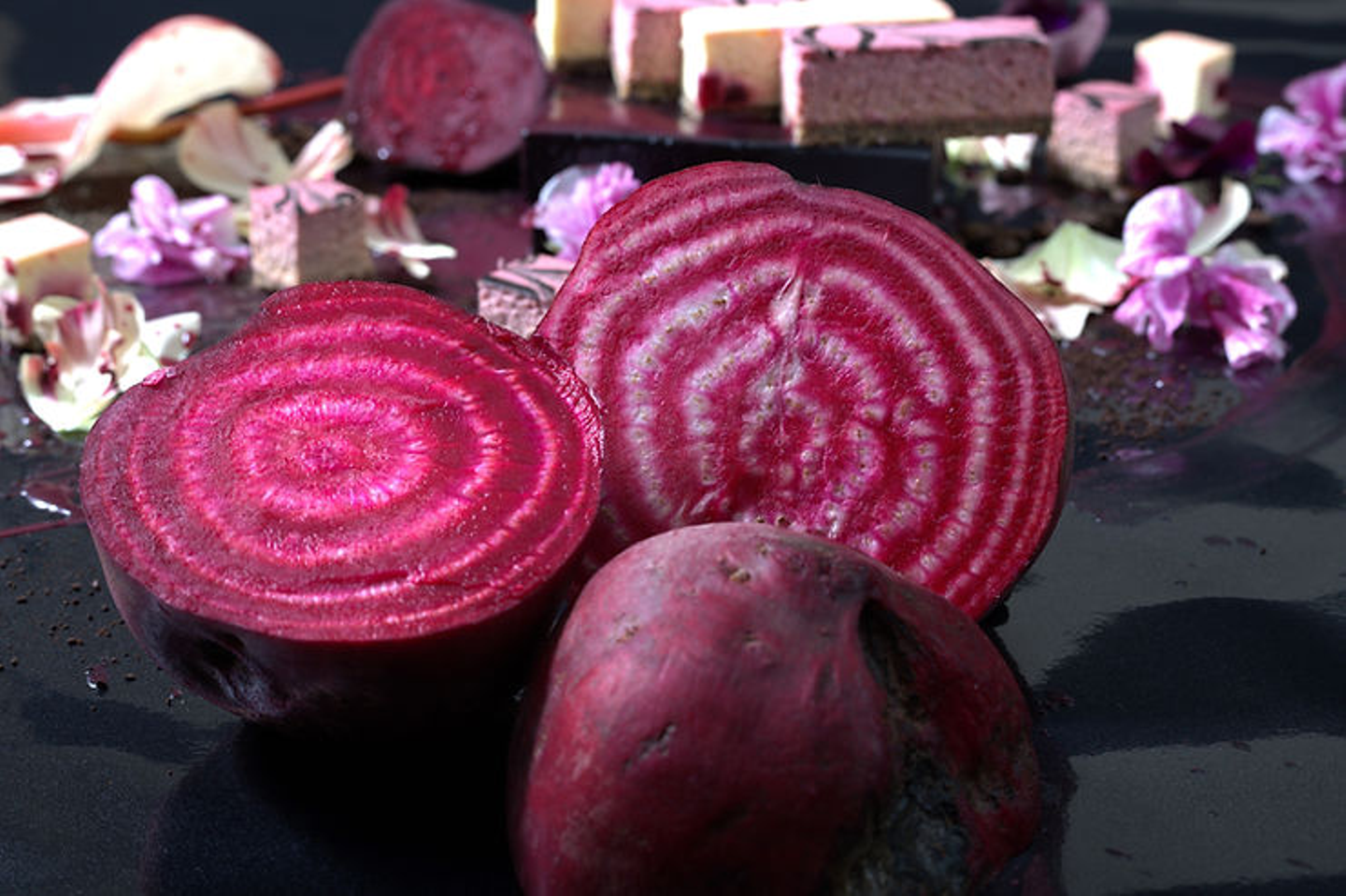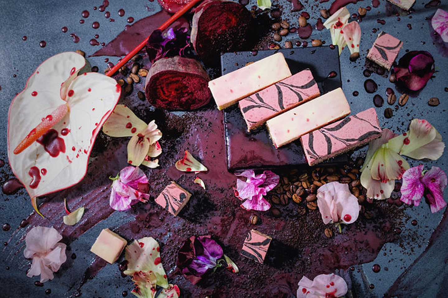 ▼ゴロっとビーツのチーズケーキ 「ゴロっとビーツのチーズケーキ」は、角切りにしたビーツを散りばめています。ビーツの鮮やかな色合いがチーズケーキににじみ出し、YUKIYAMESHIらしい美しさを演出。さらに、ビーツの食感がアクセントとなり、味覚だけでなく食感も楽しめます。